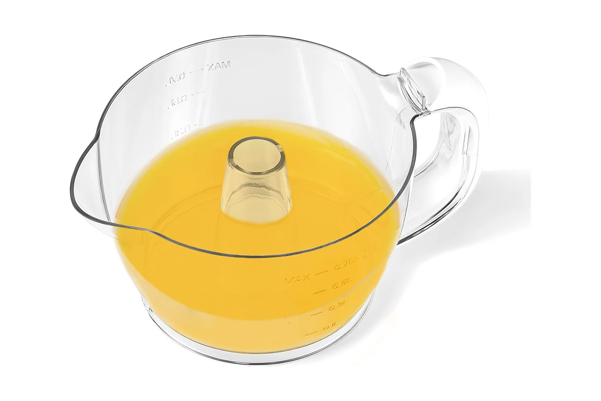 Чтобы привести соковыжималку в действие, нужно надавить плодом на конус для отжима сока, и конус начнет вращаться. Конус может вращаться в двух направлениях, что позволит отжать из цитрусовых максимальное количество сока. Подача сока осуществляется в лоток для сока. На лоток для сока нанесена мерная шкала. Удобный носик и ручка лотка позволят аккуратно перелить сок в другую емкость.