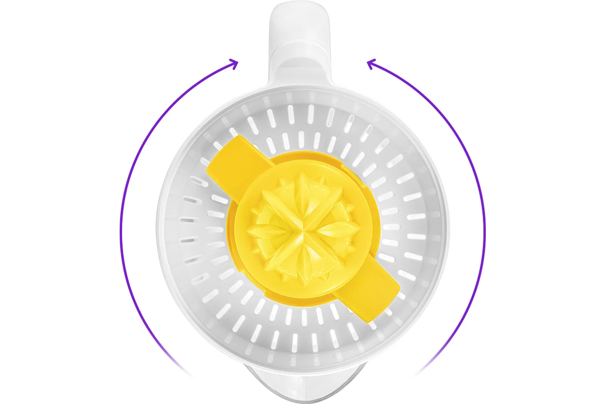 Чтобы привести соковыжималку в действие, нужно надавить плодом на конус для отжима сока, и конус начнет вращаться. Конус может вращаться в двух направлениях, что позволит отжать из цитрусовых максимальное количество сока. Подача сока осуществляется в лоток для сока. На лоток для сока нанесена мерная шкала. Удобный носик и ручка лотка позволят аккуратно перелить сок в другую емкость.