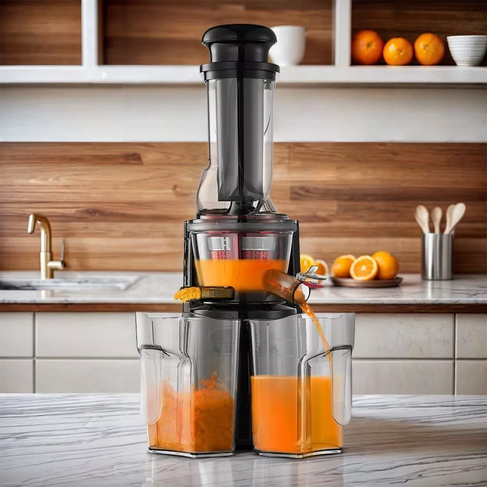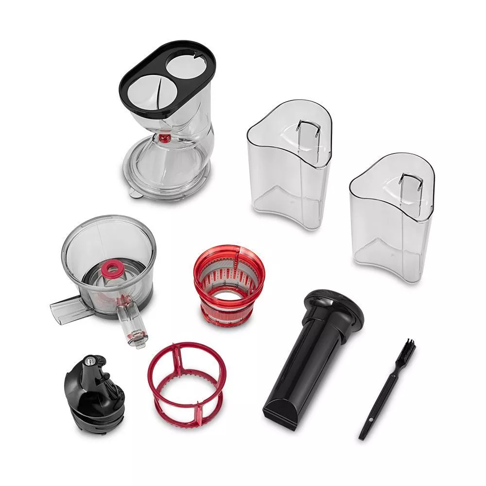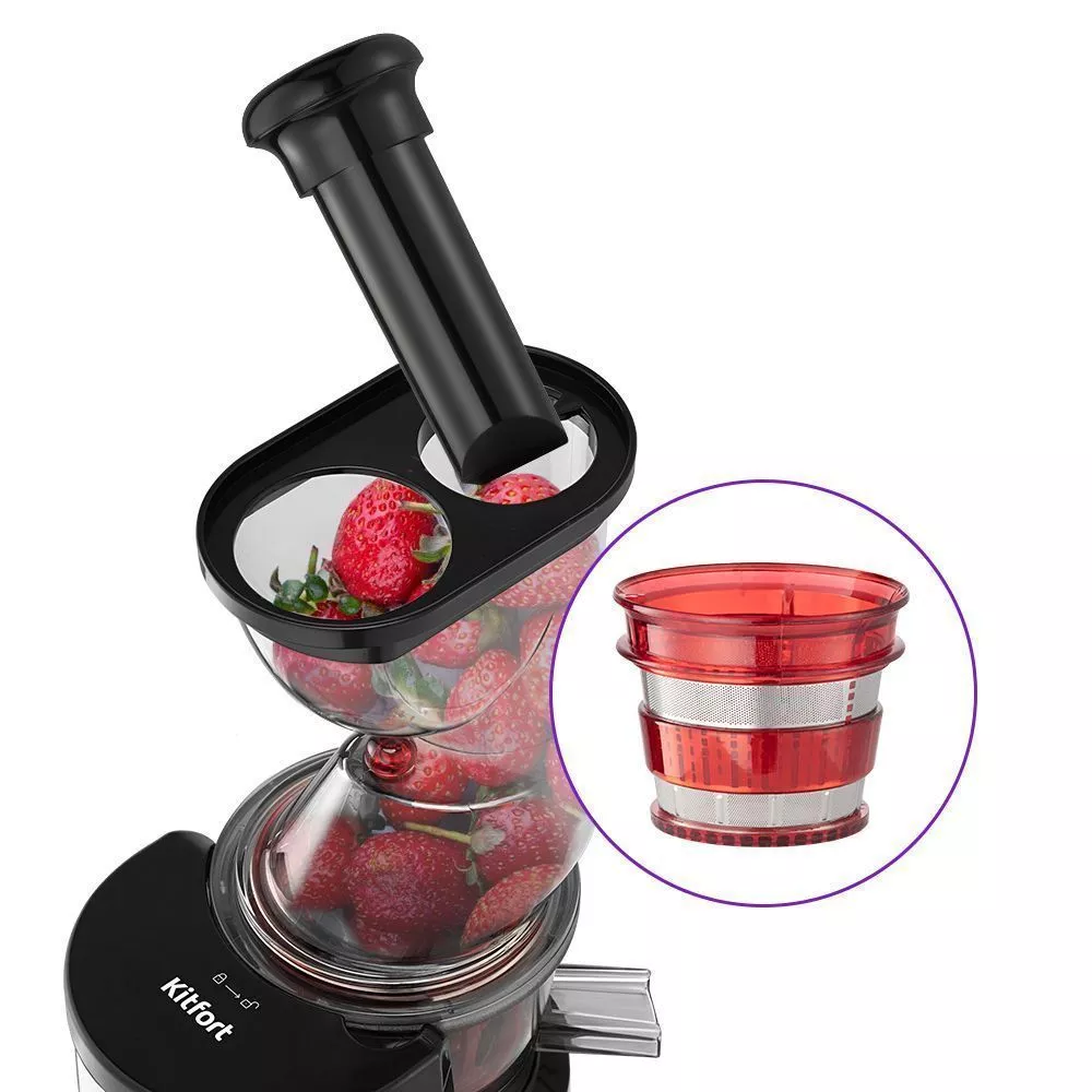 Шнековая соковыжималка КТ-1162 позволяет отжимать максимально возможное количество сока из фруктов, большинства овощей и зелени с сохранением всех их полезных компонентов: витаминов, аминокислот и минералов. Быстро собирается и легко моется после работы. Спиралевидный шнек-пресс из ультрапрочного материала дробит и прессует продукт, а затем продавливает мякоть через фильтр, отделяя жмых от сока. Эта технология позволяет извлечь максимальное количество питательных веществ, витаминов и ферментов. У соковыжималки КТ-1162 одна скорость работы и функция «Реверс», которая помогает, если продукты застряли и мешают работе устройства: при включении реверса шнек начинает вращаться в обратном направлении, возвращая застрявшие части продуктов. На отжимном блоке есть клапан, закрывающий отверстие для выхода сока, чтобы можно было убрать ёмкость с соком, не дожидаясь, пока остатки сока стекут из отжимного блока. Это удобно, практично и позволяет сохранить поверхность вокруг соковыжималки чистой. Фильтр сделан из нержавеющей стали и пластмассы, что делает его прочным и не подверженным коррозии. В комплекте также есть толкатель для безопасного продавливания продуктов. Загрузочная горловина с лотком удобна, например, при получении сока из ягод. Каждый из двух контейнеров ёмкостью 1 л может использоваться в качестве контейнере для сока или жмыха. Во время работы устройства под отверстия для выхода сока и жмыха должны быть установлены оба контейнера или две другие подходящие по высоте ёмкости. В комплекте к соковыжималке идёт щётка для чистки, с помощью которой удобно очищать фильтр. Соковыжималка быстро собирается и легко моется после работы. Корпус соковыжималки КТ-1162 выполнен из прочного пластика, выдерживающего большие нагрузки. Благодаря компактной конструкции соковыжималка не занимает много места на кухне, а прорезиненные ножки с присосками прочно фиксируют устройство.