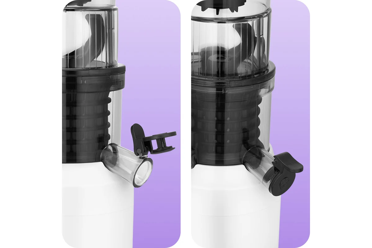 В шнековых соковыжималках принцип работы схож с мясорубкой: в загрузочную горловину подаются ингредиенты, далее шнек захватывает продукт, выдавливает из него сок и отбрасывает в сторону жмых. Весь процесс происходит быстро благодаря продуманной форме шнека и отжимного блока, распределяющего в разные стороны сок и жмых.