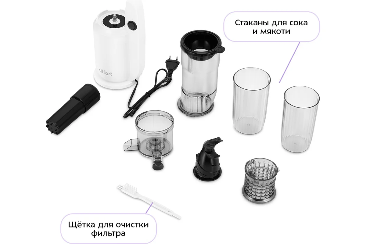 Шнековая соковыжималка KT-1164 позволяет отжимать максимально возможное количество сока из фруктов, большинства овощей и зелени с сохранением всех их полезных компонентов: витаминов, аминокислот и минералов. Соковыжималка быстро собирается и легко моется после работы.