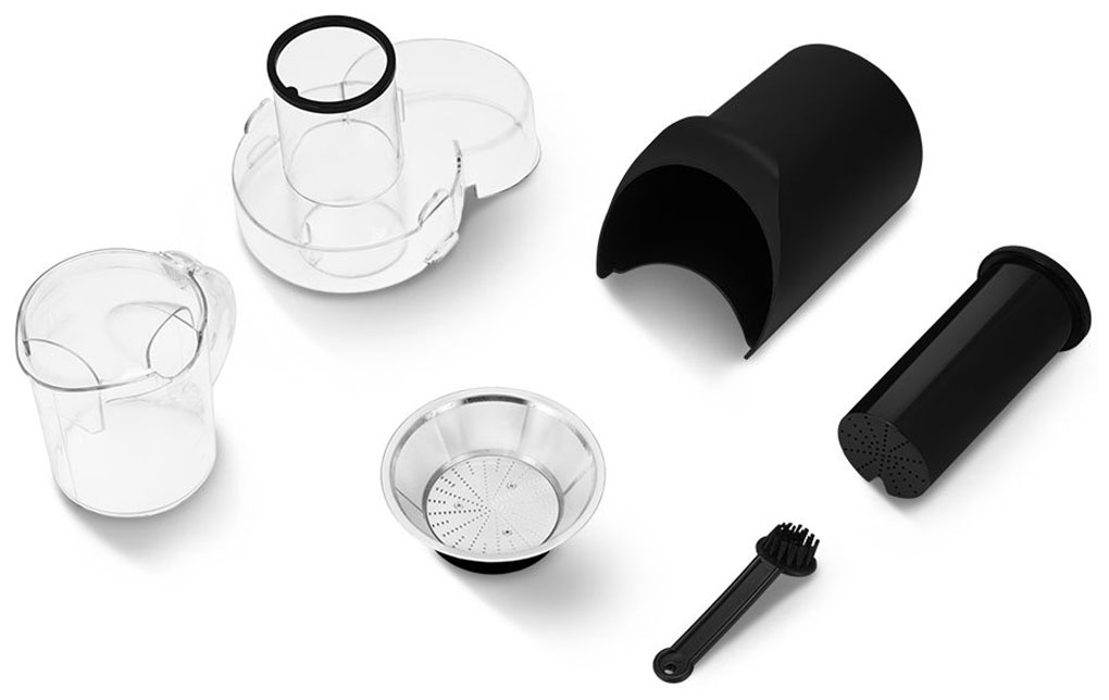В комплект к самой соковыжималке входят щелевой фильтр, отделяющий сок от пенки, щётка для чистки, контейнер для жмыха, контейнер для сока, толкатель и чаша с патрубком для выхода сока.