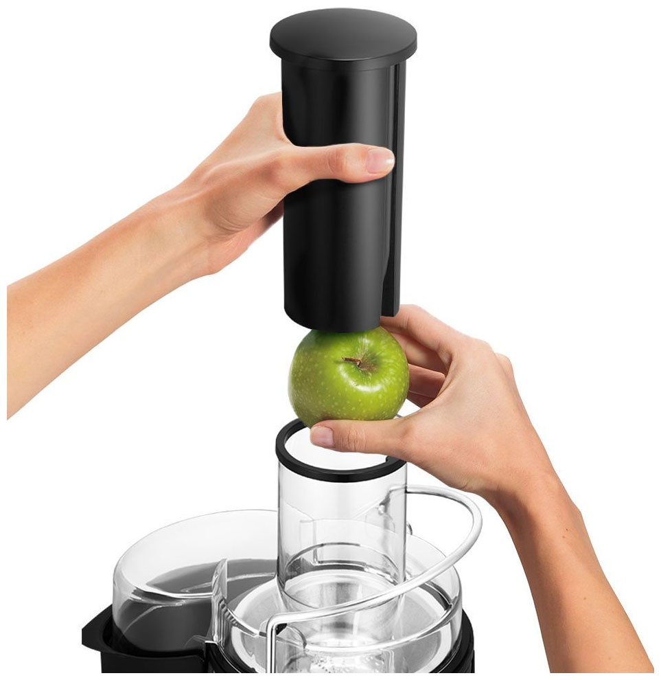 Соковыжималка позволяет отжимать практически любые фрукты и овощи. Для продуктов разной твёрдости предусмотрено 2 скорости. После отжима сока – в контейнер попадает сухой жмых, который потом можно утилизировать или использовать в других рецептах.