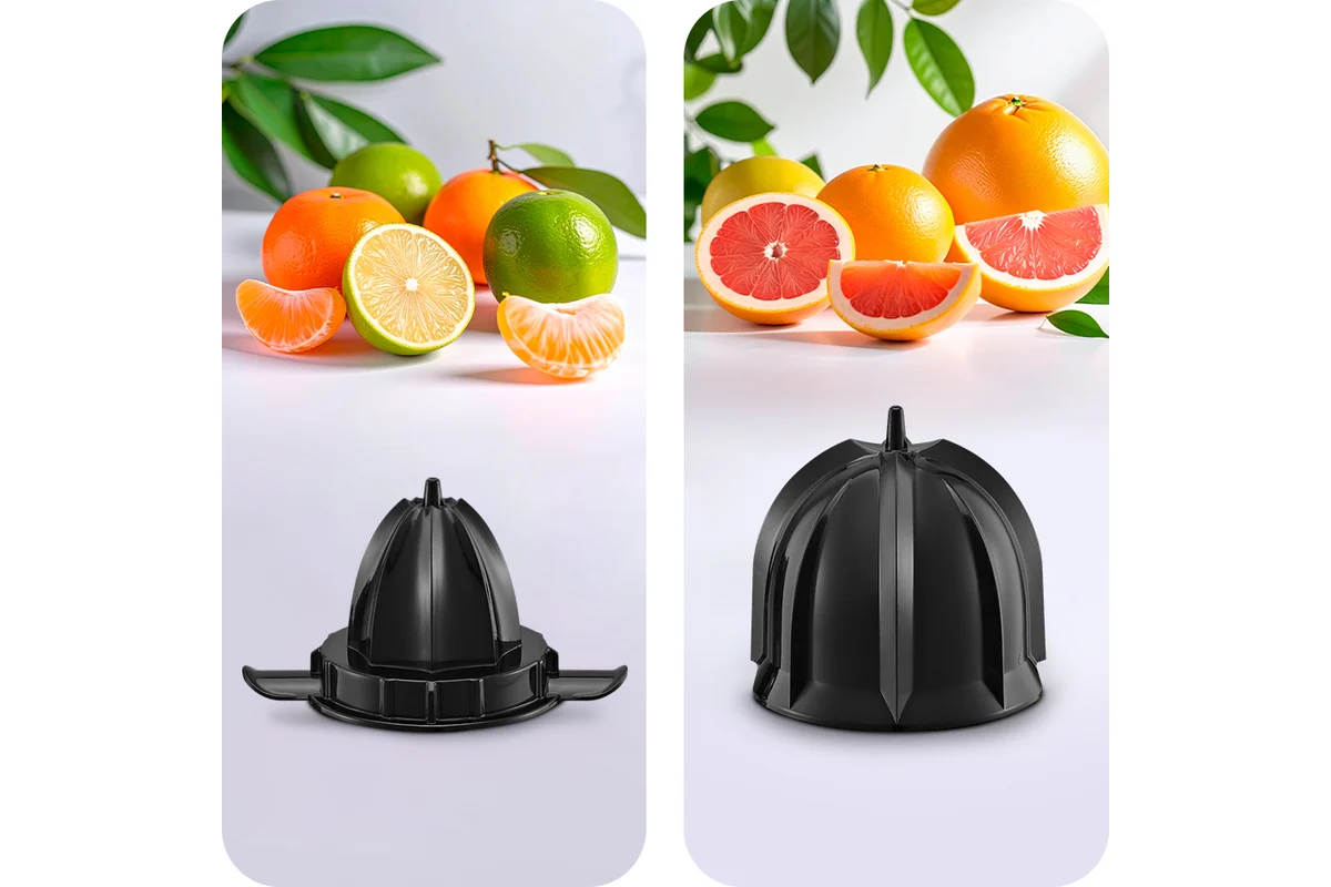 Чтобы привести соковыжималку в действие, нужно надавить плодом на конус для отжима сока, и конус начнет вращаться. Конус может вращаться в двух направлениях, что позволяет отжать из цитрусовых максимальное количество сока. Также это защищает двигатель от чрезмерной нагрузки при блокировке: когда конус начинает вращаться с трудом, меняется направление вращения. Благодаря наличию фильтра крупные куски и косточки не попадают в сок. В комплекте к соковыжималке идет два конуса: малый конус для небольших плодов, таких как лимоны или лаймы, и большой конус для апельсинов, грейпфрутов и других крупных цитрусовых.