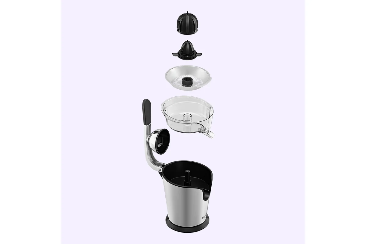 Крышка, конусы, фильтр, чаша, а также шпиндель легко снимаются и моются. Прорезиненные ножки с присосками не дают прибору скользить по столу во время отжима сока.