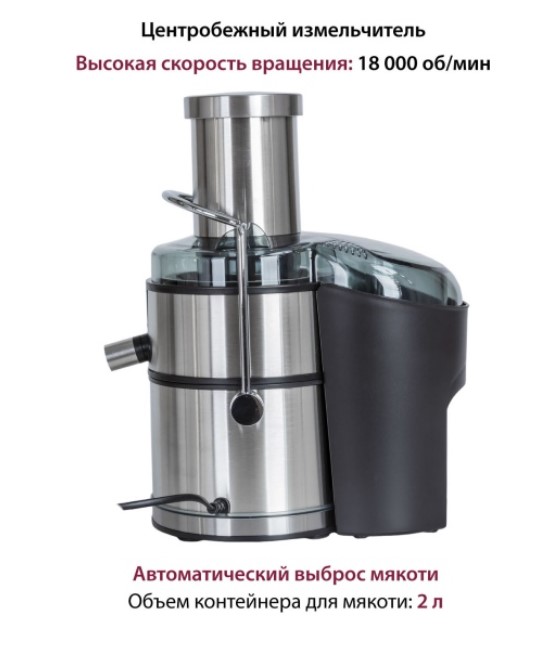 - Комплектация: соковыжималка, гарантийный талон, инструкция на русском языке