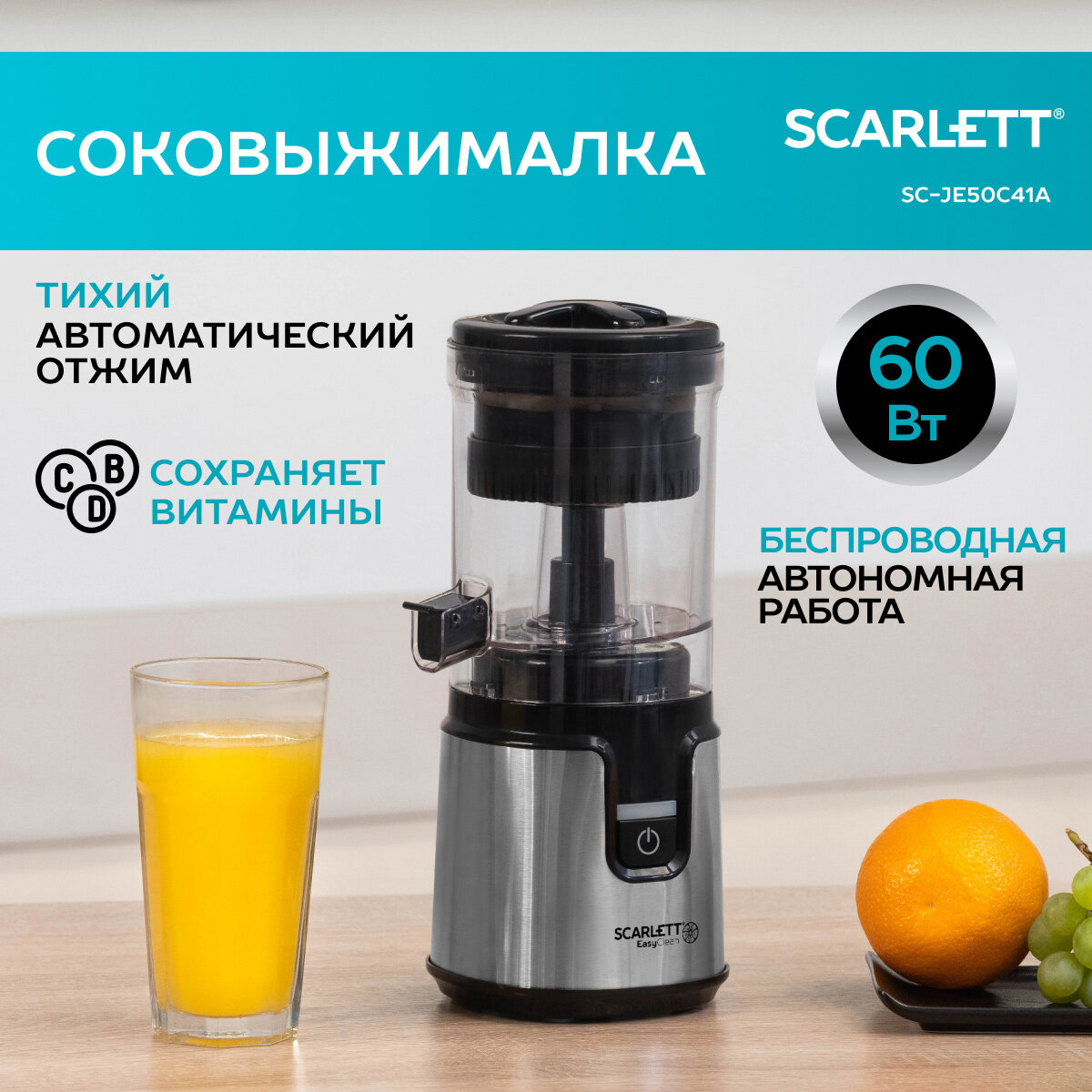 Компактная соковыжималка SC-JE50C41А предназначена для получения сока из любых цитрусовых фруктов или ягод. Благодаря работе от аккумулятора соковыжималку можно использовать в любом месте и в любое время. Система «Антикапля» сохранит рабочую поверхность в чистоте, а наличие прорезиненных ножек повысит устойчивость прибора во время работы. SC-JE50C41A – практичный прибор для получения свежих натуральных соков ежедневно.