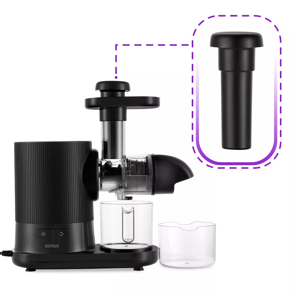 Корпус соковыжималки КТ-1139 выполнен из прочного пластика. В комплекте с соковыжималкой идёт толкатель. Он необходим для безопасной эксплуатации прибора. Соковыжималка оснащена узкой горловиной, крупные продукты перед отжимом необходимо порезать на части