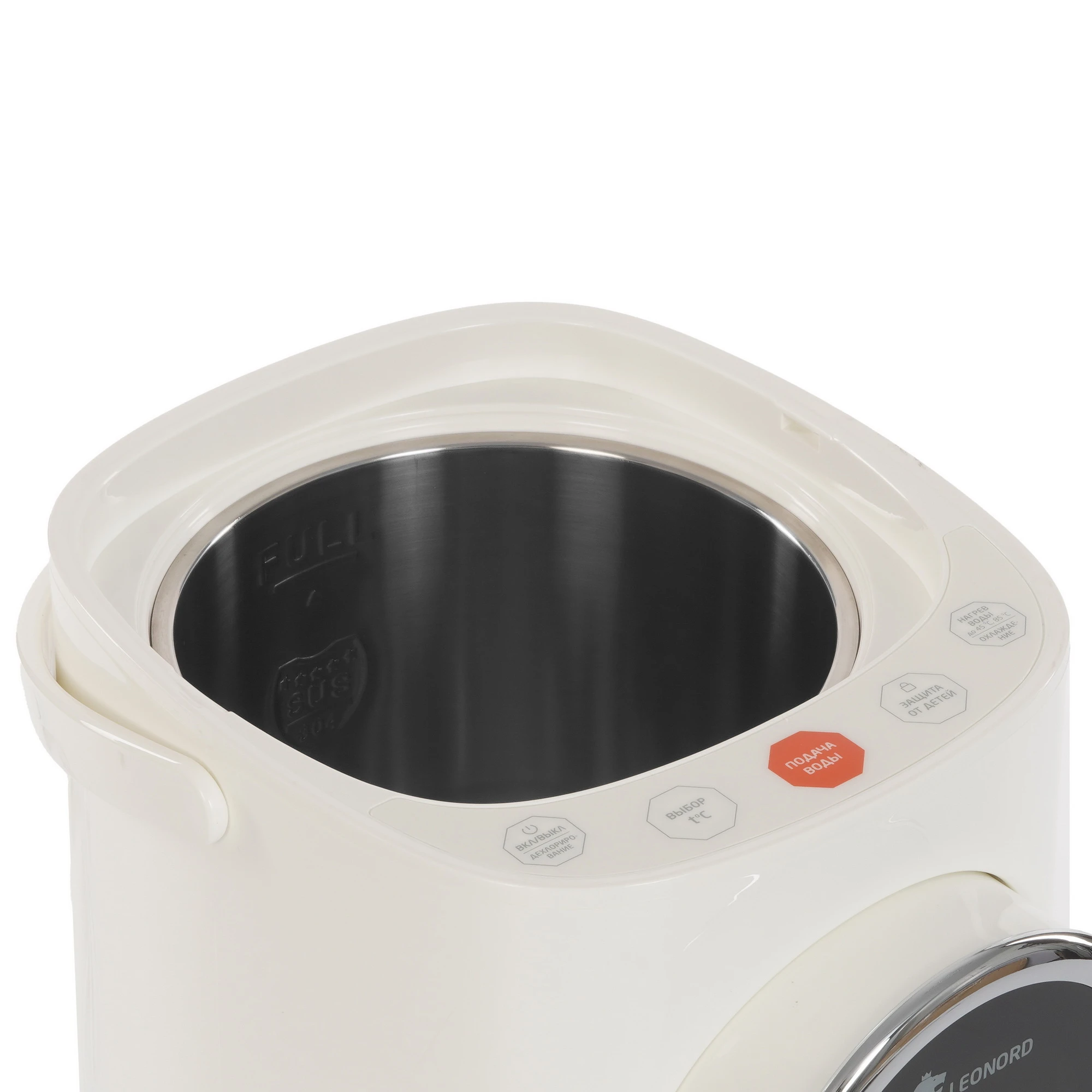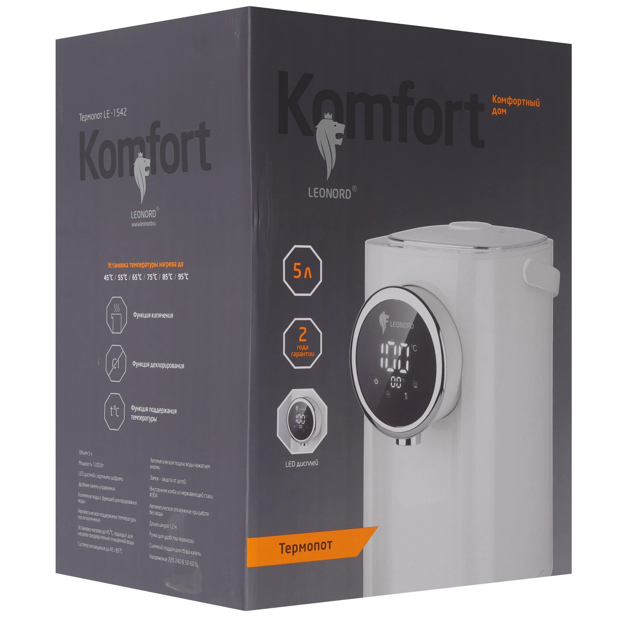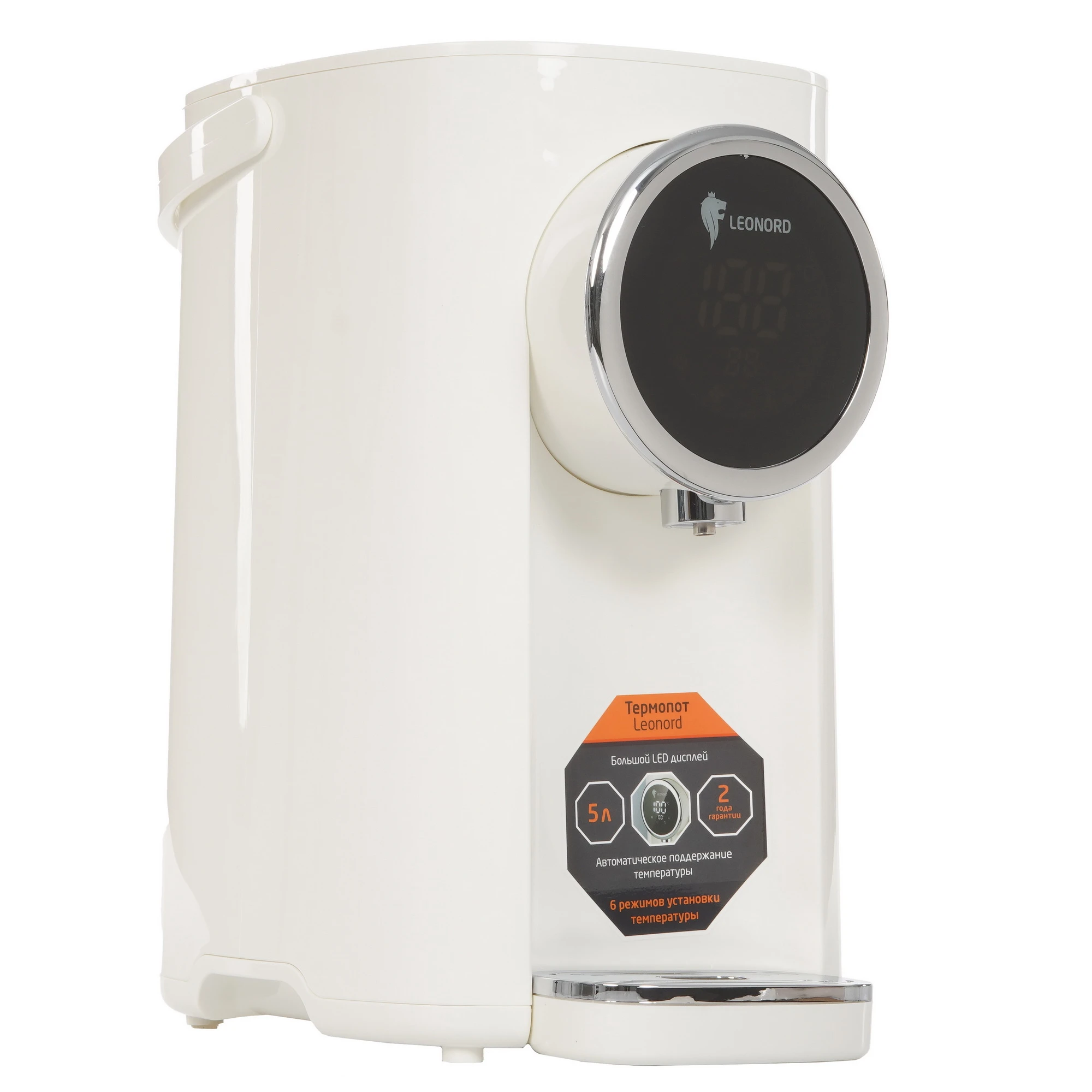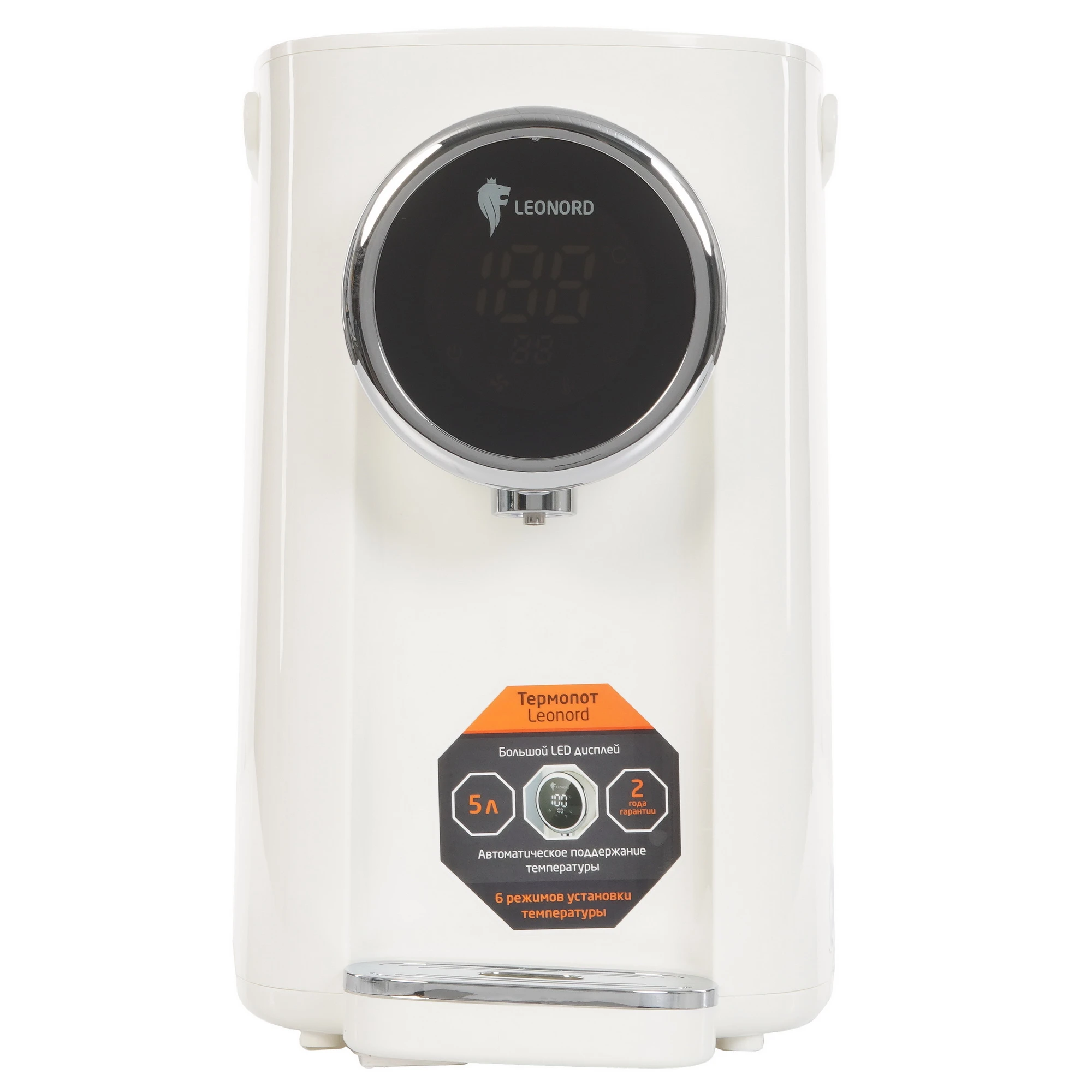 Термопот Leonord LE-1542 в корпусе белого цвета оборудован 3 режимами работы, в том числе для удаления хлора из воды. Кнопочная панель управления позволяет регулировать температуру нагрева от 45 C до 95 C. Функция поддержания температуры предупреждает остывание жидкости. Термопот Leonord LE-1542 имеет дисплей, который отображает выбранные параметры работы. Блокировка ограничивает возможность включения прибора при нехватке воды в 5-литровом резервуаре. Съемная крышка упрощает очистку и наполнение емкости. Ручка служит для транспортировки модели. Влага поступает в съемный поддон.