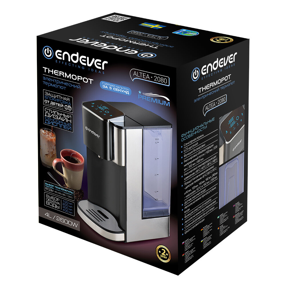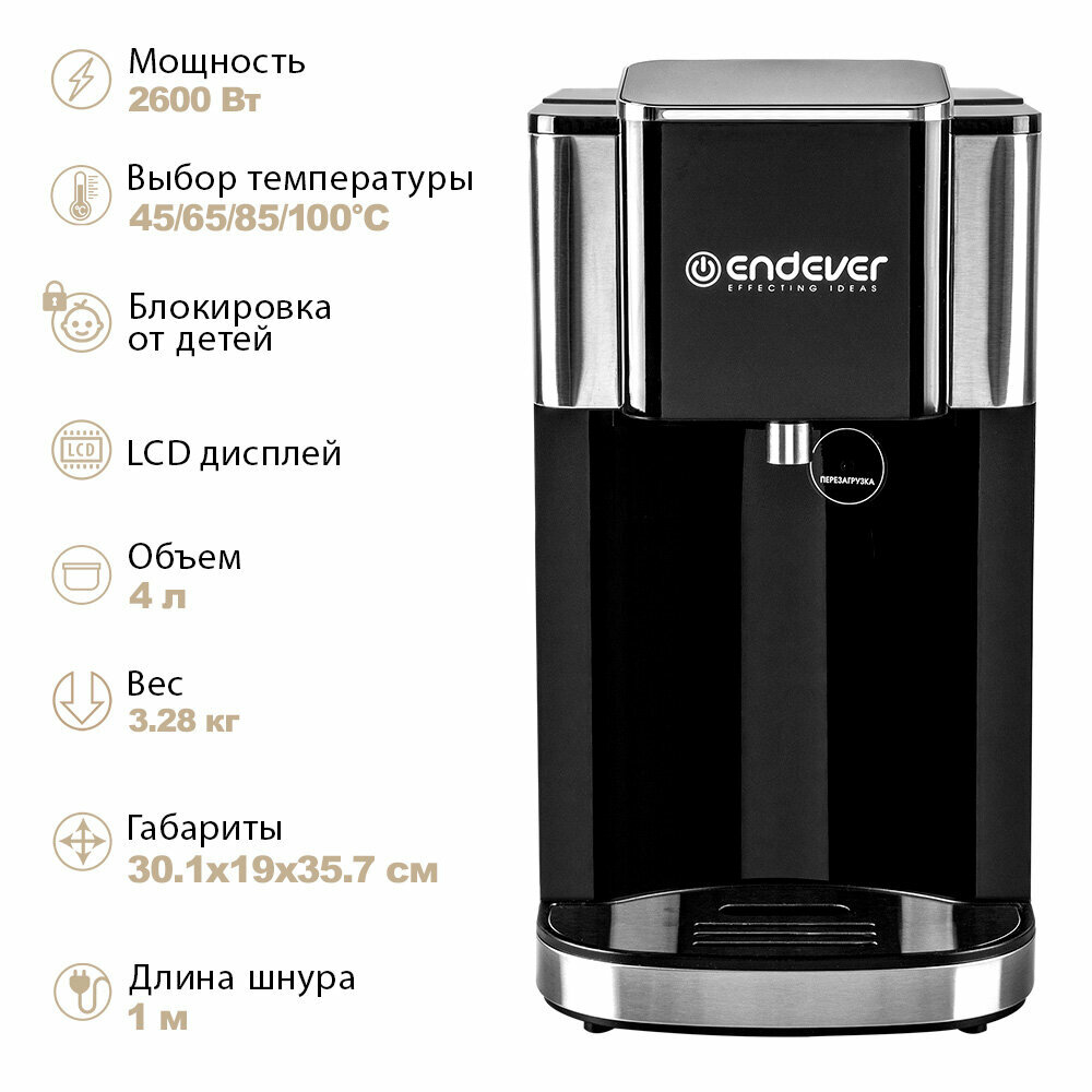 Сенсорная панель, LCD-дисплей, Функция блокировки, Регулировка объёма порции: непрерывный поток / 100 мл / 200 мл / 300 мл / 400 мл, Регулировка температуры воды: комнатная / 45°С / 65°С / 85°С /100°С, Предустановленные режимы:- детское питание: 40°С/55°С/70°С и 90 мл, 120 мл, 150 мл, 180 мл, 240 мл - чай/кофе: 92°С и 150 мл / 300 мл, Датчик наличия воды, Автоотключение при отсутствии воды, Функция очистки от накипи, Автоотключение при перегреве, Съемный резервуар для воды, Шкала уровня воды