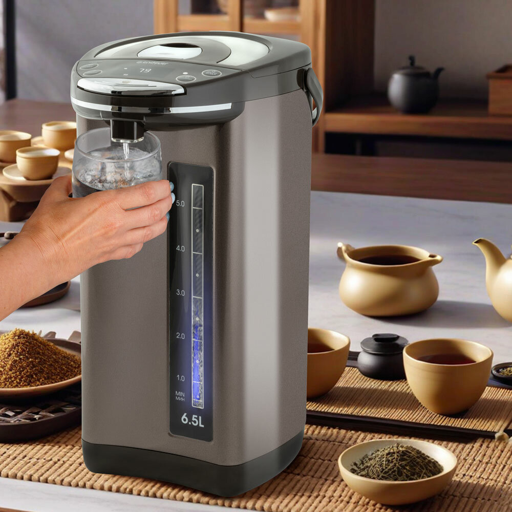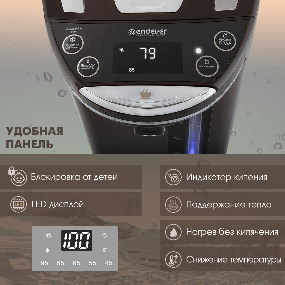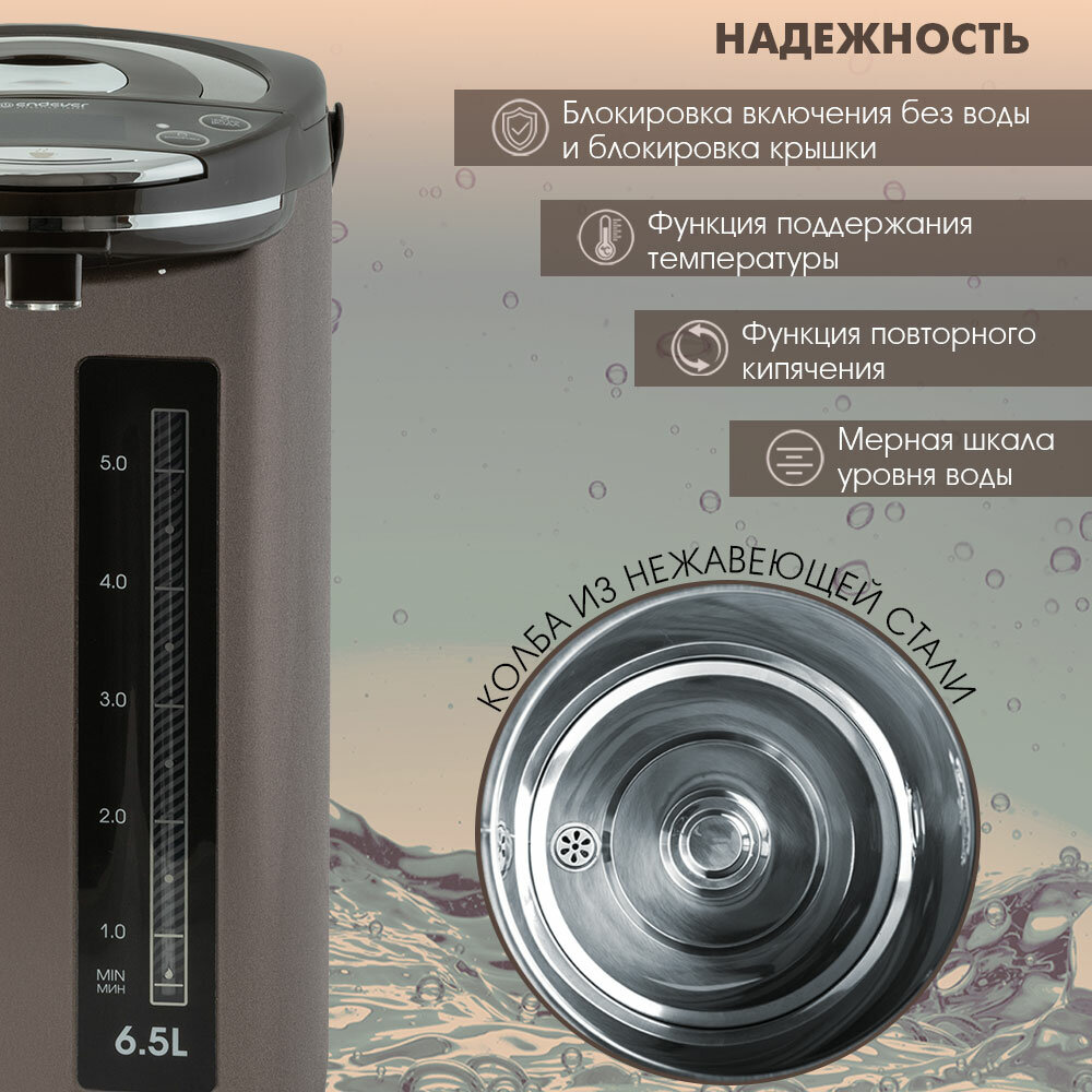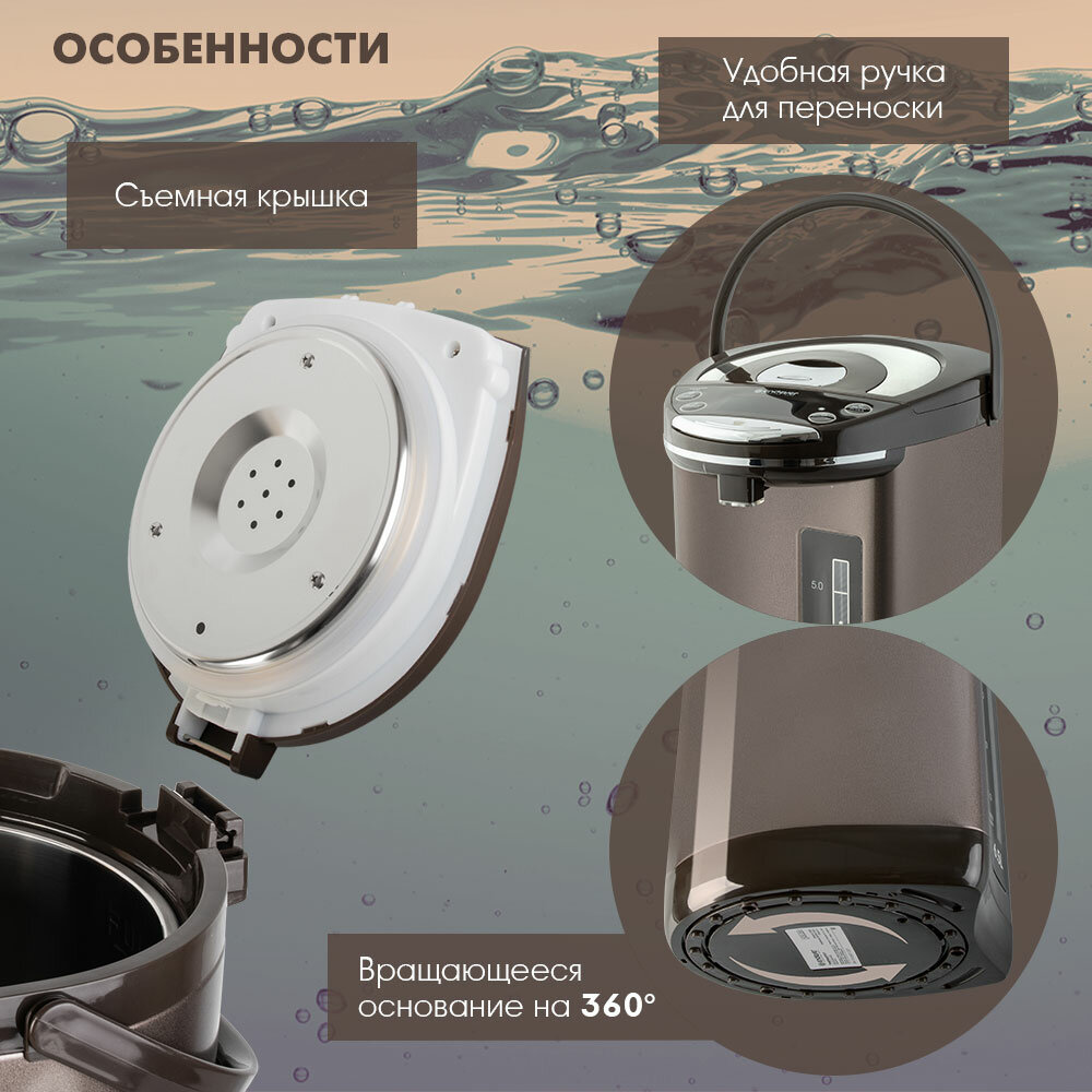 Два способа подачи воды: автоматический, касанием чашки, 6 режимов температуры нагрева воды: 45 /55 / 65 / 85 / 95°C + температура окружающей среды, Функция поддержания температуры, Функция повторного кипячения, Индикатор уровня воды, Блокировка включения без воды и блокировка крышки, Материал колбы: нержавеющая сталь, Тип нагревательного элемента: закрытый, Съемная крышка, Вращение на основании на 360°, Удобная ручка для переноски