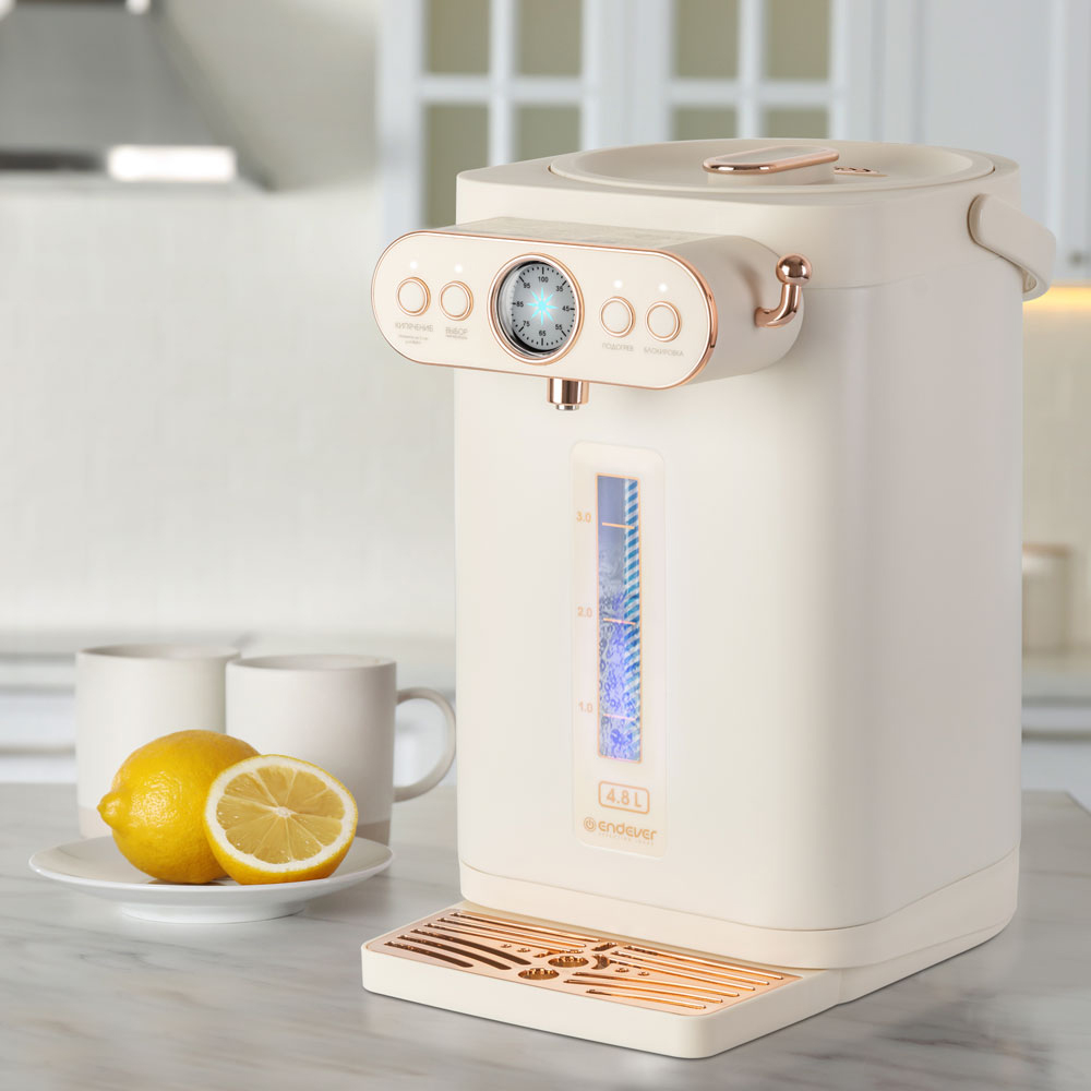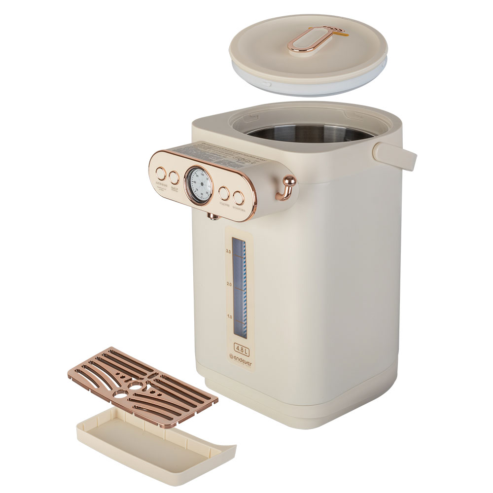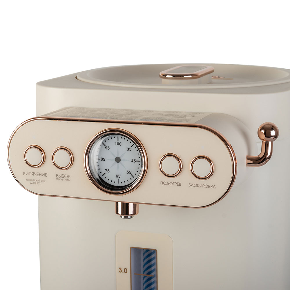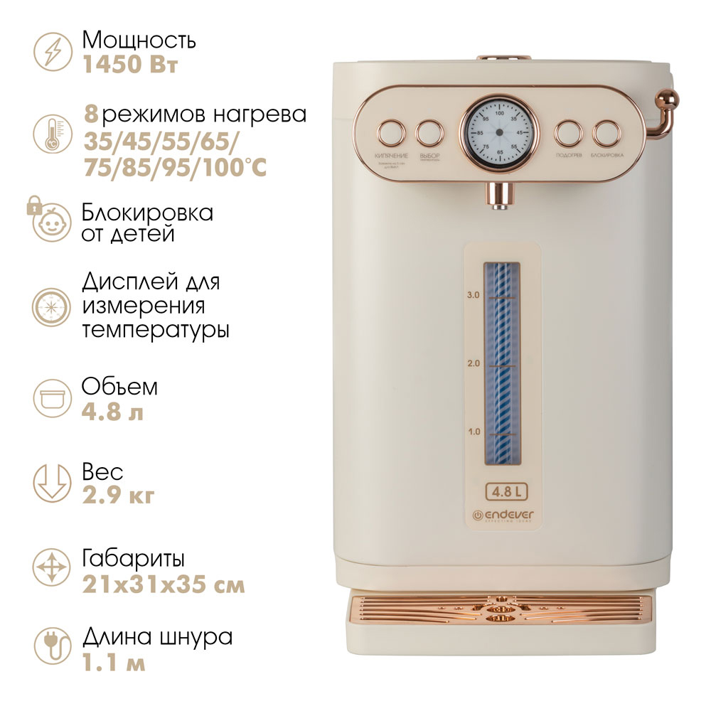 Способ подачи воды: механический – рычаг на корпусе, 8 режимов температуры нагрева воды: 35 /45 /55 / 65 / 75 / 85 / 95°C, Автоматическое поддержание температуры воды, Дисплей для измерения температуры, Функция запоминания объёма воды, Функция повторного кипячения, Индикатор уровня воды, Защитная блокировка от детей, Блокировка включения без воды, Материал колбы: нержавеющая сталь, Тип нагревательного элемента: скрытый, Съемная крышка, Удобная ручка для переноски