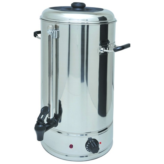 Кипятильник электрический заливной GASTRORAG DK-WB-10 настольный, автономный (наливной), емкость резервуара 10 л, открытый ТЭН, терморегулятор, мерное стекло, сливной кран, материал корпуса - нерж.сталь.