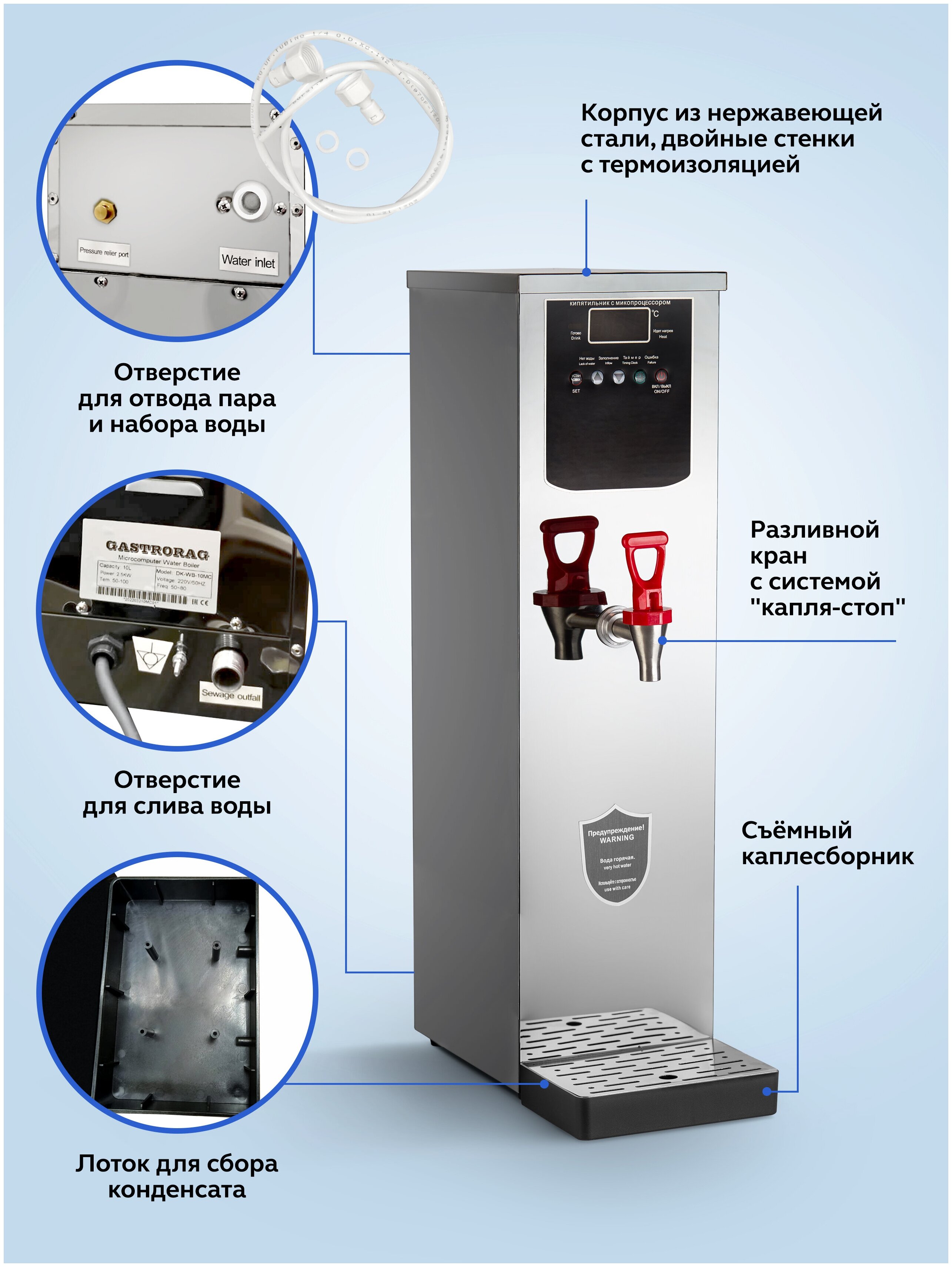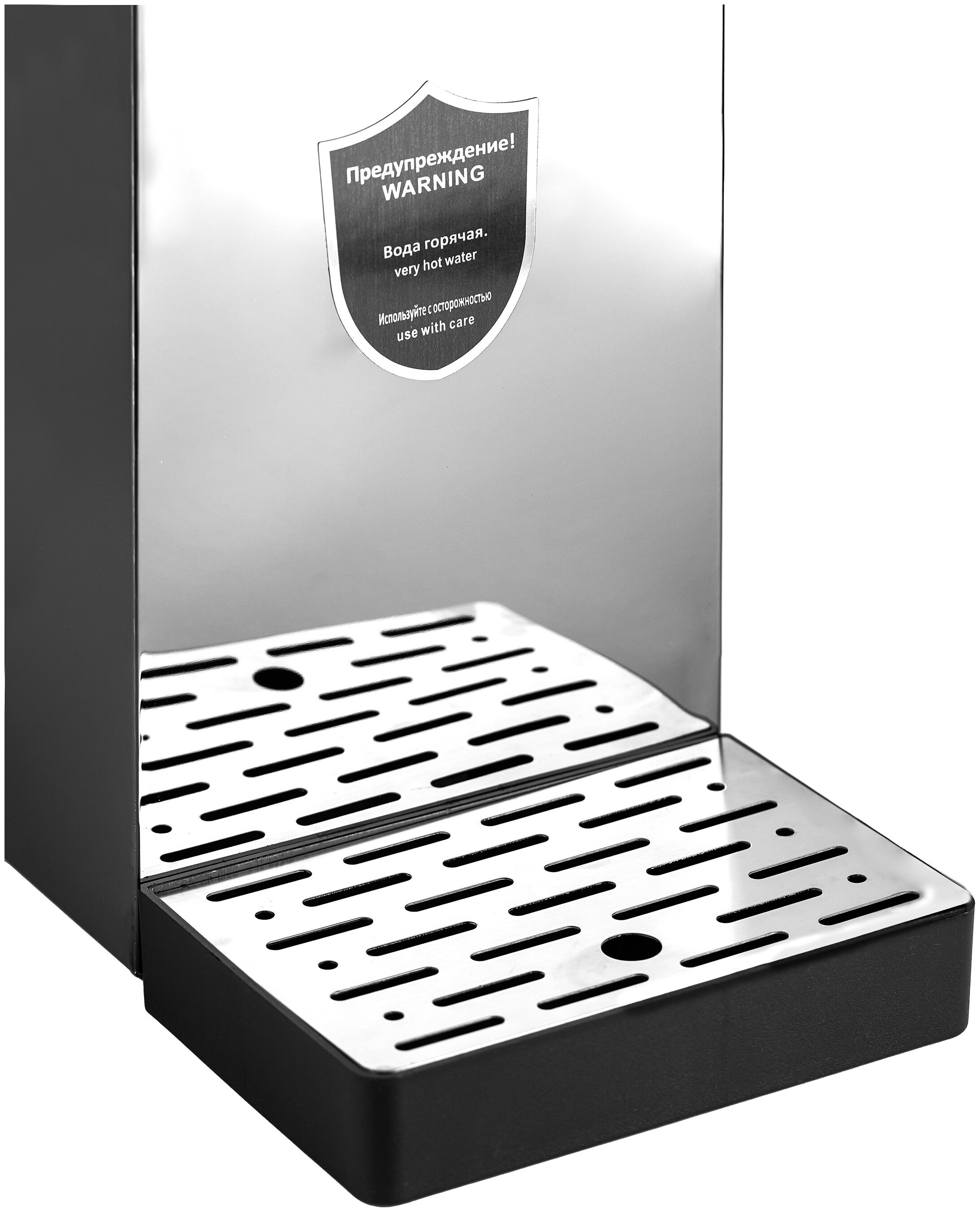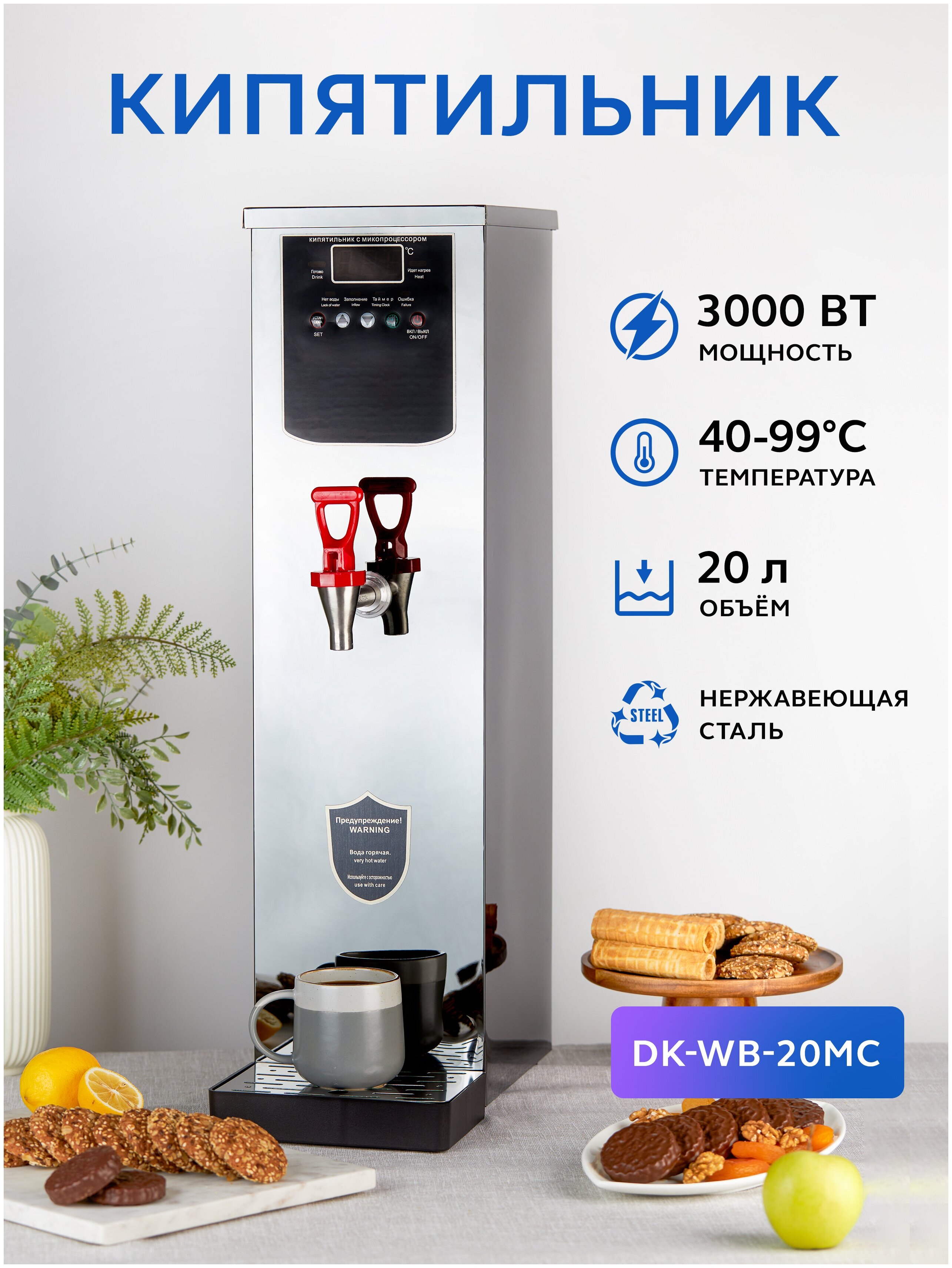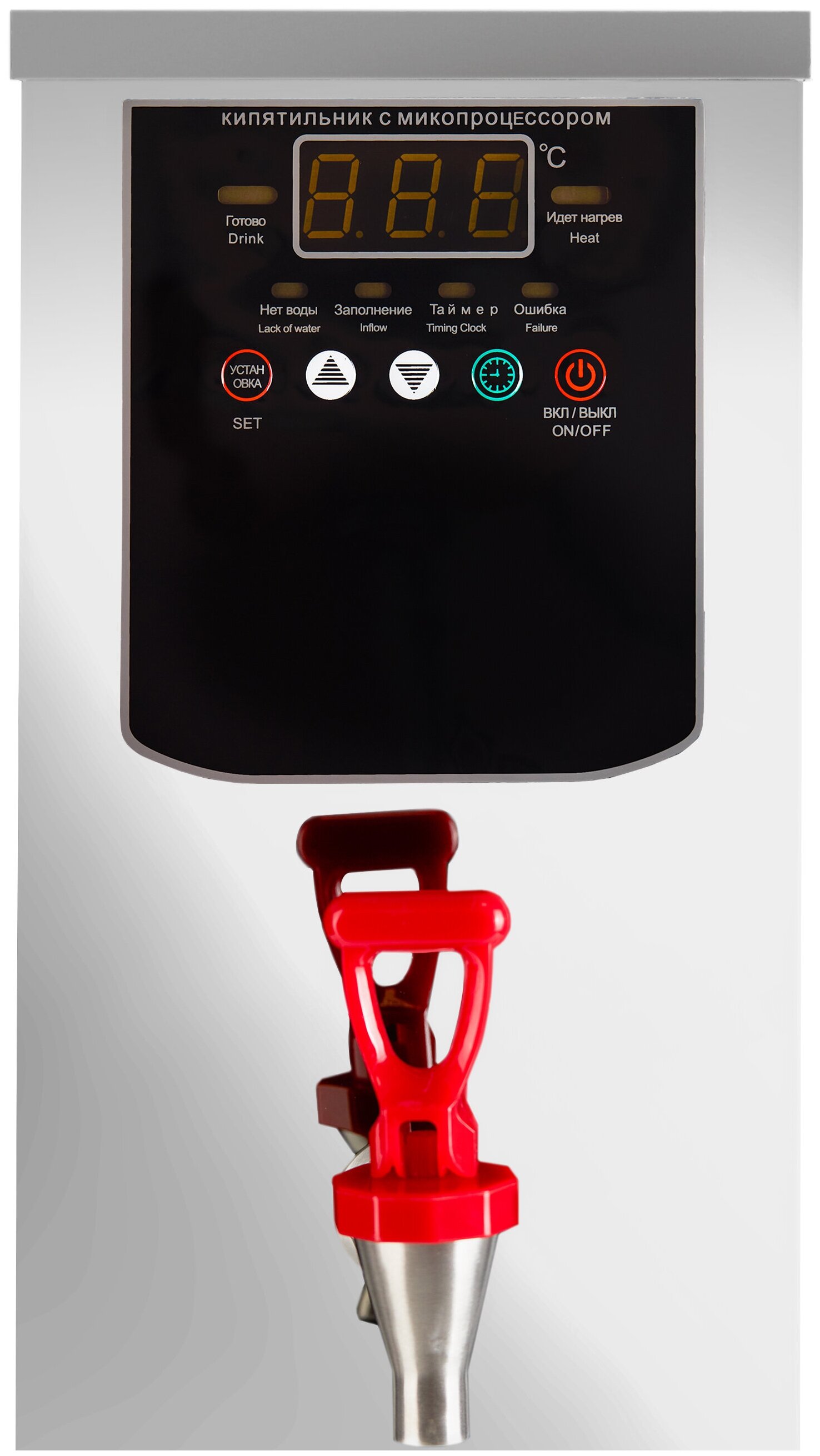 Кипятильник электрический большой непрерывного действия DK-WB-20MC – это техника для профессиональной кухни, которая требует подключения не только к электросети, но и к водопроводу, и позволяет персоналу и посетителям кафе, ресторанов, школ, больниц, офисов и прочих общественных учреждений непрерывно разливать кипяток, не заботясь об уровне воды в резервуаре. Электрокипятильник проточный работает по инновационной технологии пошагового, или послойного нагрева воды, контролируемого микропроцессором. ТЭН электрооборудования греет не всю воду в резервуаре, а лишь небольшой ее слой, который можно сразу же сливать и использовать. Это позволяет избежать смешивания сырой и кипяченой воды, как в проточных кипятильниках с поплавковым клапаном, а также значительно повышает скорость кипячения и производительность оборудования по сравнению с кипятильниками наливного типа. Производительность кипятильника DK-WB-20MC, резервуар которого имеет объем 20 л, вдвое больше, как у заливного кипятильника объемом 20 л. Микропроцессорное управление позволяет регулировать температуру воды с высокой точностью и в широком диапазоне (40-99оС) и обеспечивает только одно закипание, помогая избежать многократного кипячения. Режим работы может быть задан как круглосуточный, так и со включением и выключением в определенное время для каждого дня недели. Устройство обеспечивает автоматический контроль за уровнем и температурой воды, имеет защиту от сухого хода, от переполнения и функцию самодиагностики, которая позволяет своевременно выявлять неполадки в работе. Розлив воды осуществляется через металлический кран с пластмассовым рычагом. Корпус электрокипятильника изготовлен из нержавеющей стали. Компактные размеры позволяют размещать его в помещениях ограниченной площади, проходах и коридорах. В комплект кипятильника входит вместительный каплесборник.