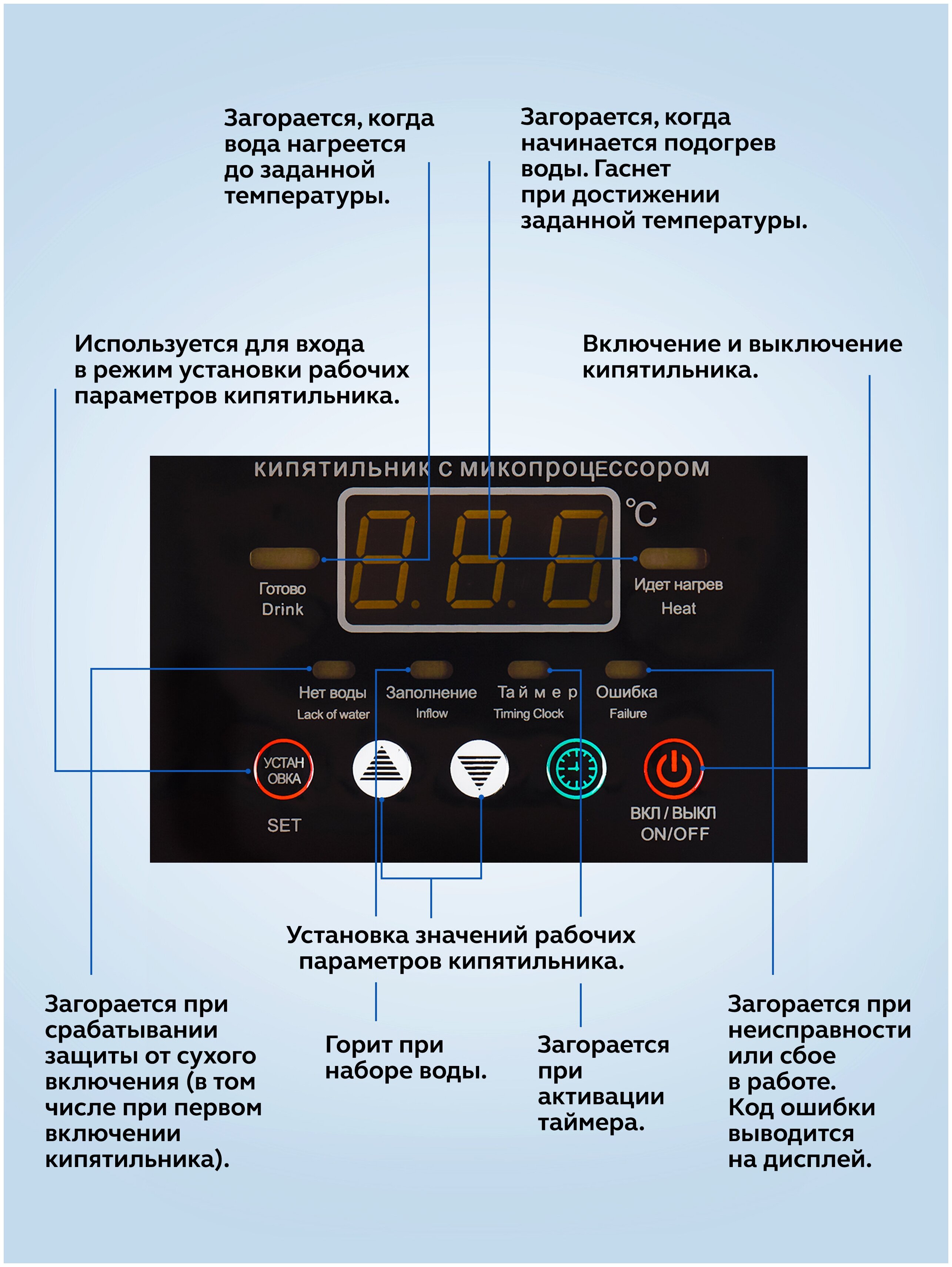Особенности устройств для нагрева воды: Дисплей, Регулировка температуры, Поддержание постоянной температуры, Светоиндикатор работы, Таймер