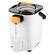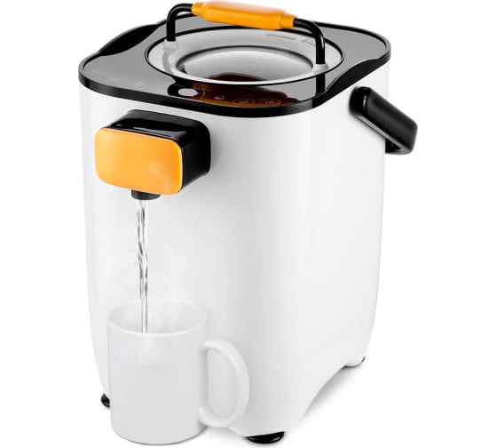 Двойные стенки термопота помогают сохранить тепло и реже включать нагрев, что поможет сэкономить на электроэнергии. Корпус термопота состоит из пластика, а резервуар и внутренняя часть крышки — из нержавеющей стали.