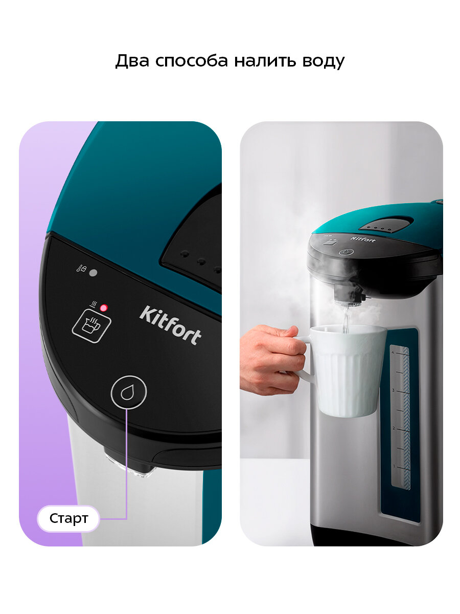 Термопот КТ-2526 — это удобный и практичный прибор. Он быстро нагревает воду до 100 °C. Если температура падает ниже 75 градусов, термопот автоматически вскипятит её снова. Также можно включить повторное кипячение, чтобы вновь нагреть воду до 100 °C.