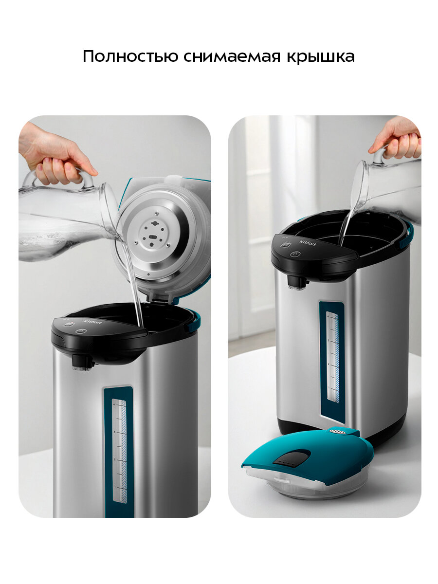Корпус выполнен из пластика и нержавеющей стали, а резервуар и внутренняя часть крышки полностью сделаны из нержавеющей стали. Двойные стенки термопота сохраняют тепло, уменьшая необходимость частого нагрева и экономя электроэнергию.