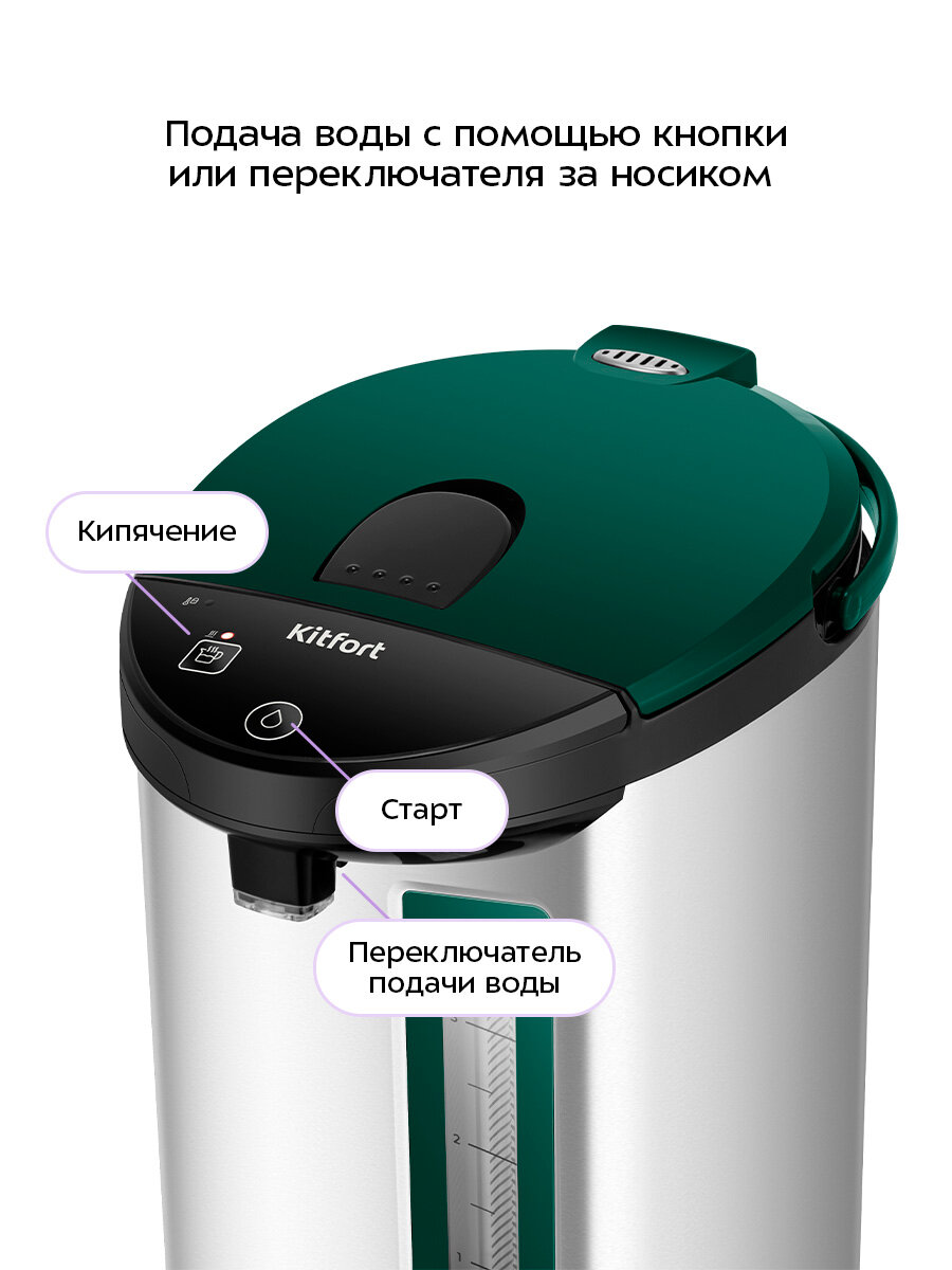 Подача воды осуществляется двумя способами: нажатием на кнопку «Старт» или нажатием кружки на специальный переключатель подачи воды, расположенный рядом с носиком термопота. Нажатие на кнопку «Кипячение» включает повторное кипячение воды.