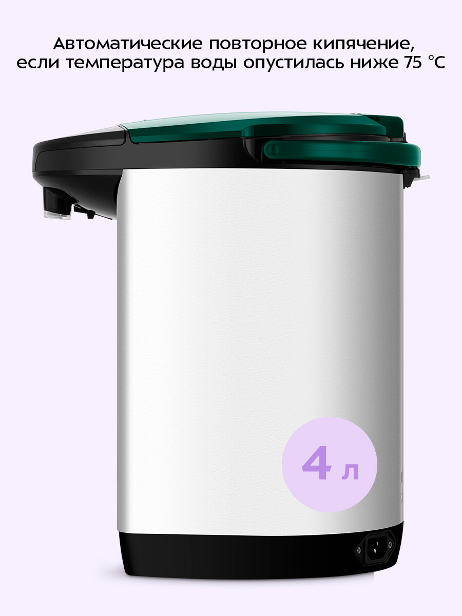 Термопот оснащён функцией автоматического повторного кипячения. Сразу после подключения устройства к сети начинается нагрев воды до 100 °C. После того как температура воды в резервуаре опустится ниже 75 °C, термопот повторно вскипятит воду.