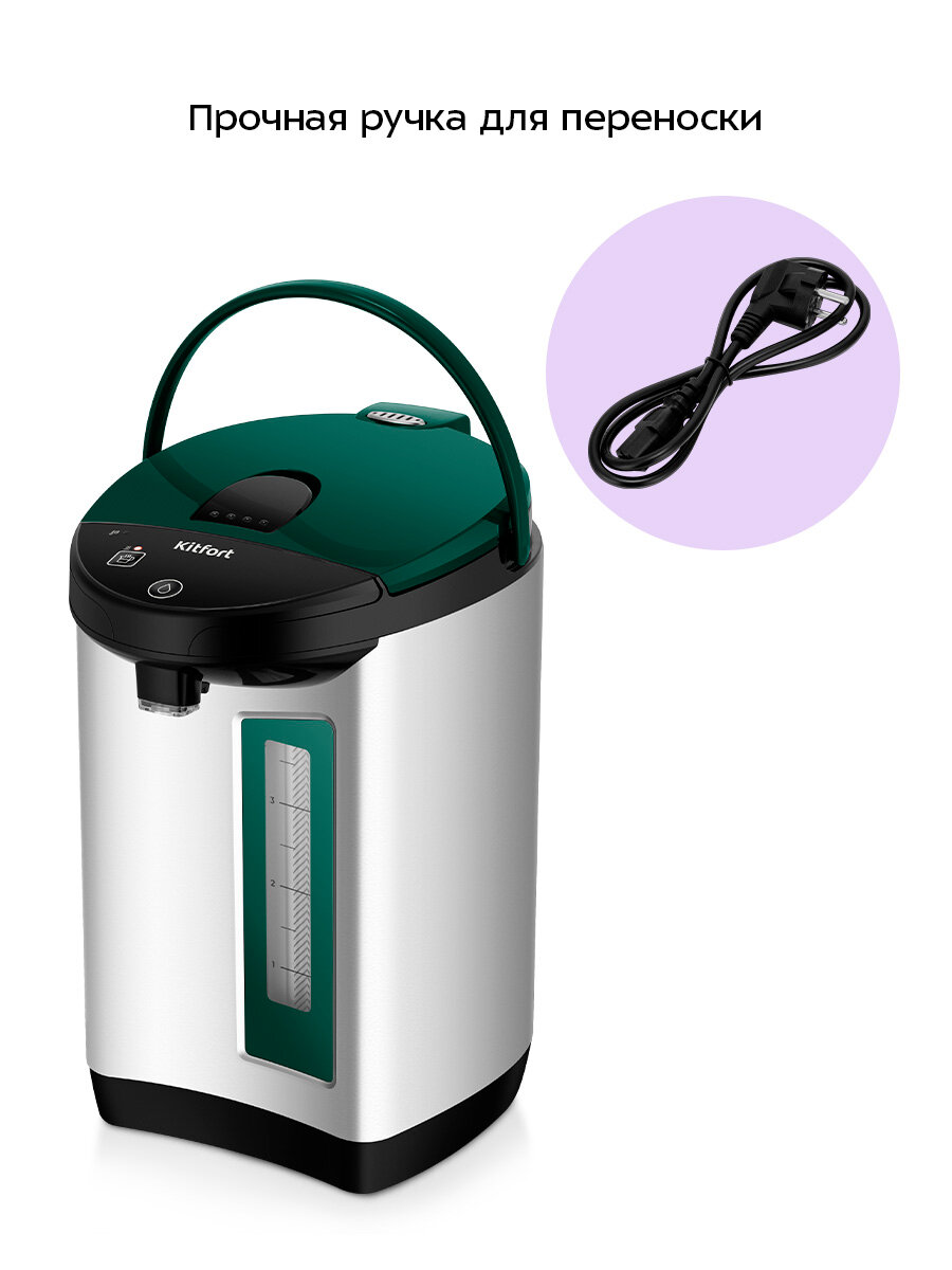 Термопот КТ-2528 предназначен для кипячения и поддержания горячей воды благодаря периодическому включению и отключению нагрева. В отличие от обычного чайника, он поддерживает температуру, обеспечивая горячую воду в любой момент.