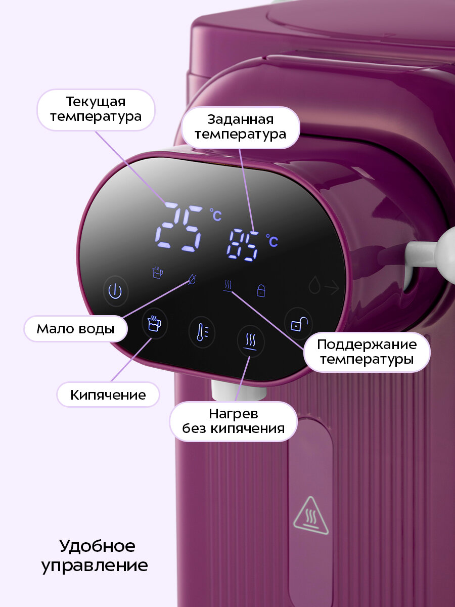 Термопот имеет дисплей для отображения температуры воды и кнопки для выбора режима работы. При отсутствии воды в резервуаре устройство подаёт звуковой сигнал, а индикатор на дисплее начинает мигать, напоминая о необходимости долить воду.