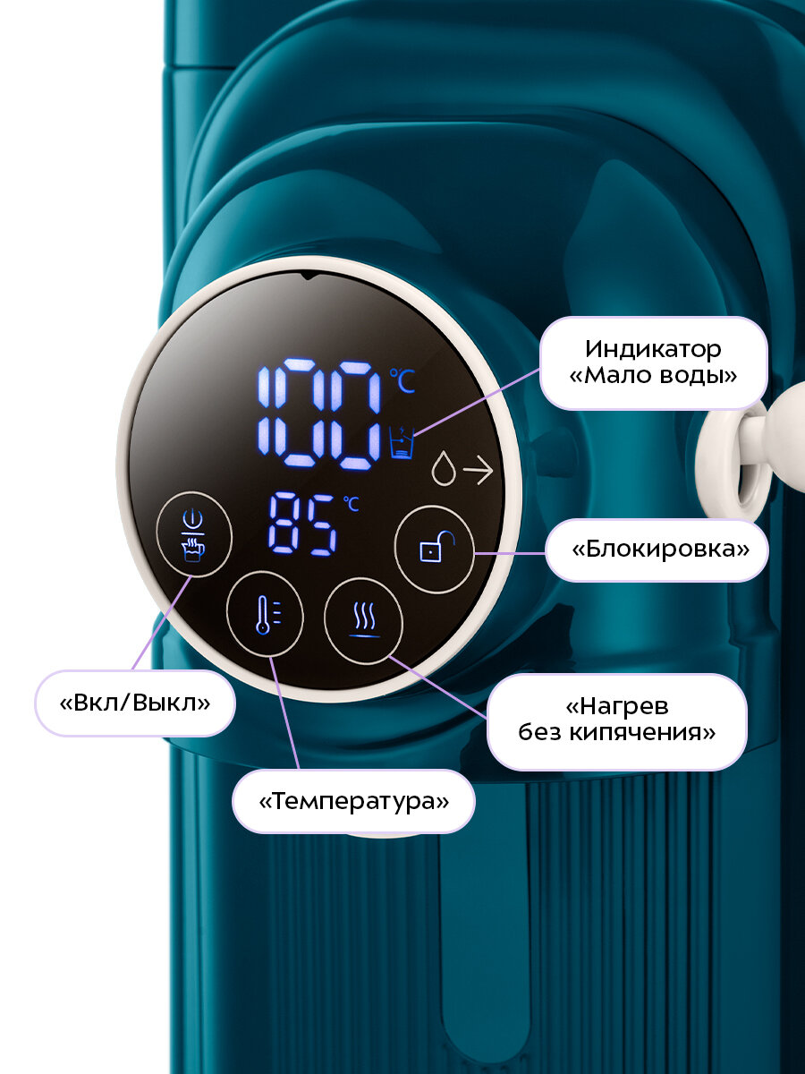 На дисплее отображается заданная и текущая температура воды в резервуаре. Когда в резервуаре недостаточно воды, устройство подаст звуковой сигнал и на дисплее будет мигать индикатор. Блокировка включения подачи воды не позволит получить случайный ожог.