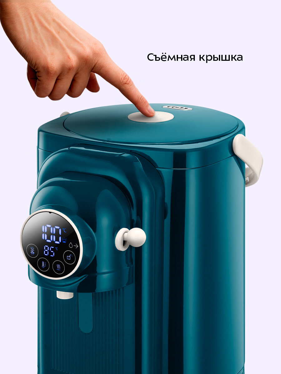 Крышка термопота съёмная. Чтобы открыть крышку, нажмите на кнопку открывания, кнопка приподнимется. Возьмитесь за неё и потяните вверх. Внутренняя часть крышки сделана из нержавеющей стали, поэтому вода не соприкасается ни с одной пластиковой частью.