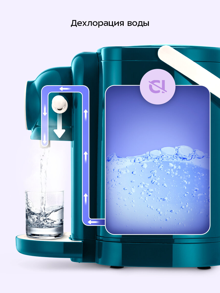 Термопот будет кипятить воду в течение 1 минуты. При длительном поддержании высокой температуры, вместе с испаряющимся паром, воду покинет большая часть хлора, содержащегося в воде.