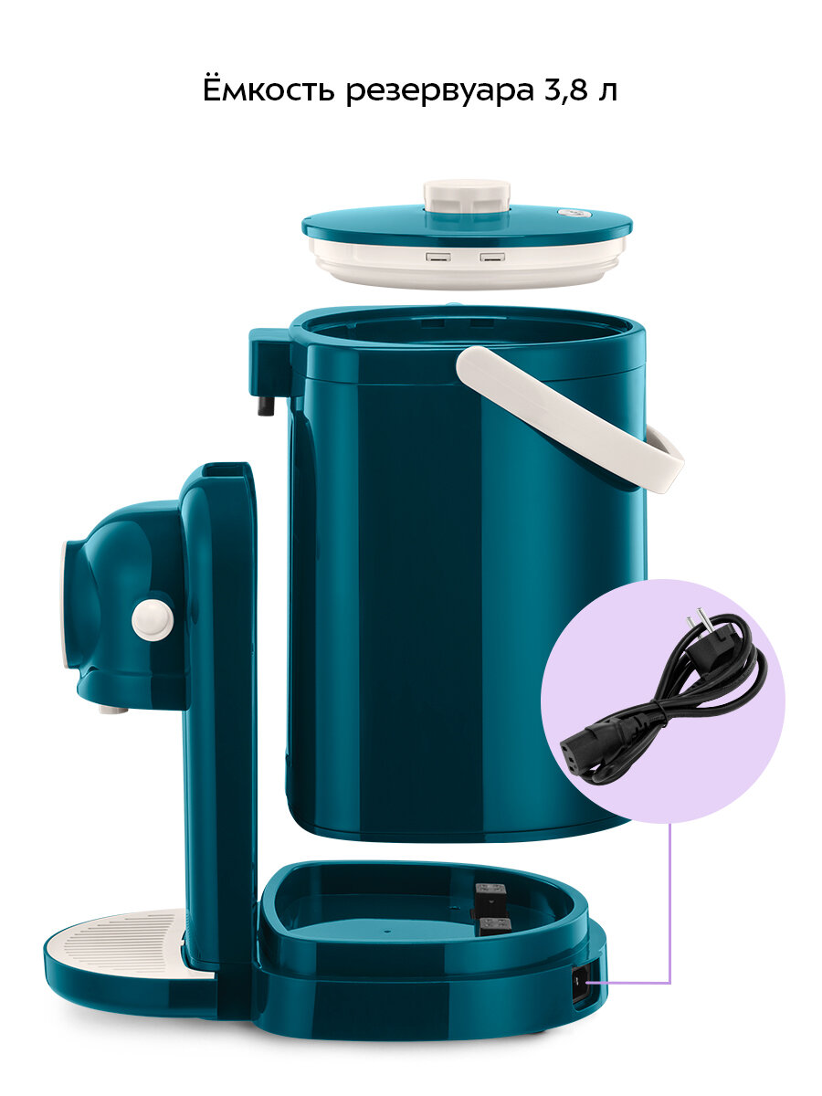 Двойные стенки резервуара для воды помогают сохранить тепло и реже включать нагрев. Корпус состоит из пластика, а внутренняя часть — из нержавеющей стали. Для удобства наливания воды и очистки резервуар снимается с основания.