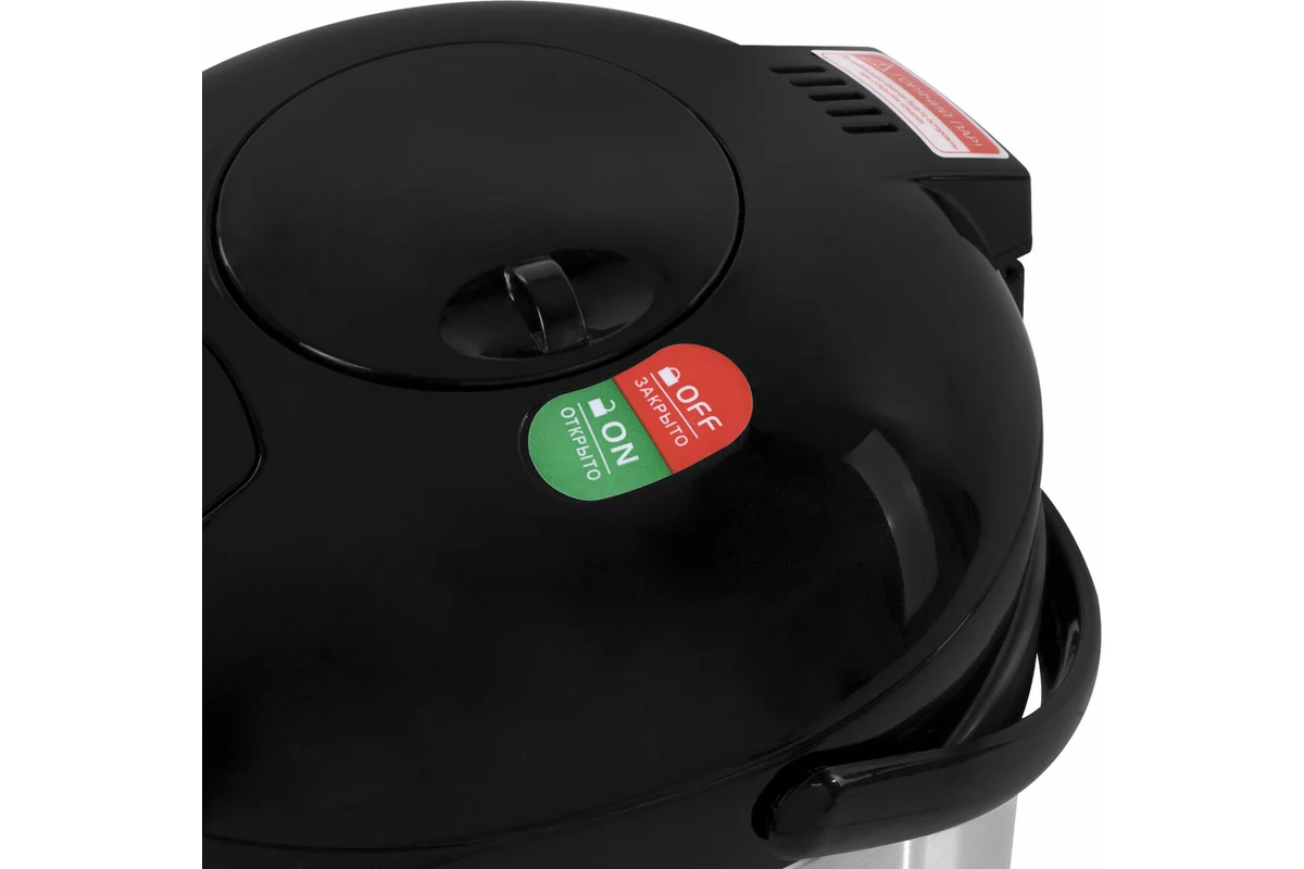 На корпусе размещена шкала уровня воды для контроля объема жидкости. Корпус дополнен прочной ручкой для удобного переноса устройства. Модель имеет вращающуюся подставку – вы можете поворачивать термопот в любую сторону, не поднимая над столом.
