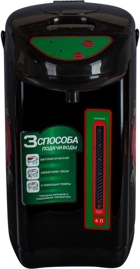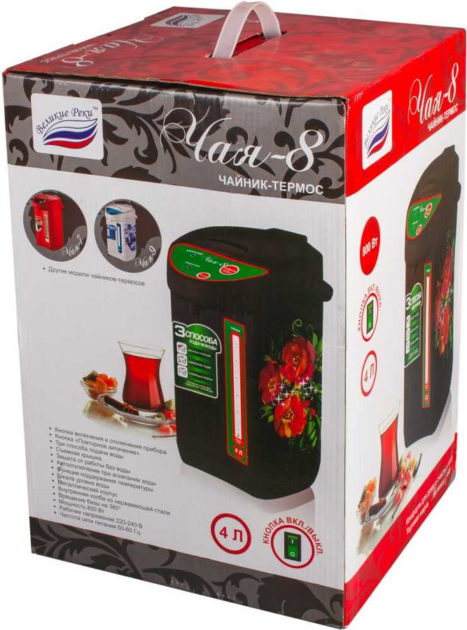 С помощью термопота Великие Реки Чая-8 Хохлома закипятить 4 л воды можно за несколько секунд. Налить жидкость в кружку также легко: достаточно поднести кружку и нажать кнопку. Комбинированный насос позволяет использовать и другие варианты: нажать кружкой на носик устройства или воспользоваться ручной помпой. При этом наклонять устройство не требуется. Термопот имеет функцию блокировки включения без воды, что защитит нагревательный элемент от перегорания, а также убережет от шалости детей. Прочный, надежный, долговечный, удобный в использовании и простой в уходе.