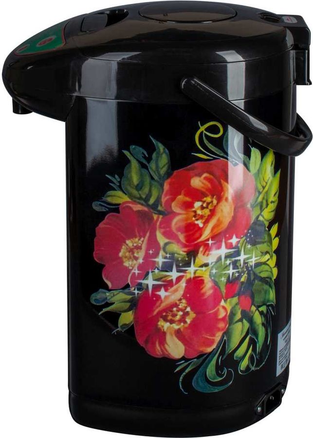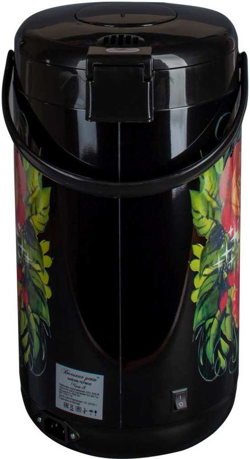 Знакомые любимые цвета хохломы нашли свое отражение в дизайне термопота Великие Реки Чая-8 Хохлома. Он является современным прибором, в котором успешно совместились функции термоса и чайника. Это позволяет не только вскипятить воду, но и поддерживать ее при нужной температуре несколько часов. Выполнен в классическом для традиций хохломского узора черном цвете, на который нанесен рисунок.