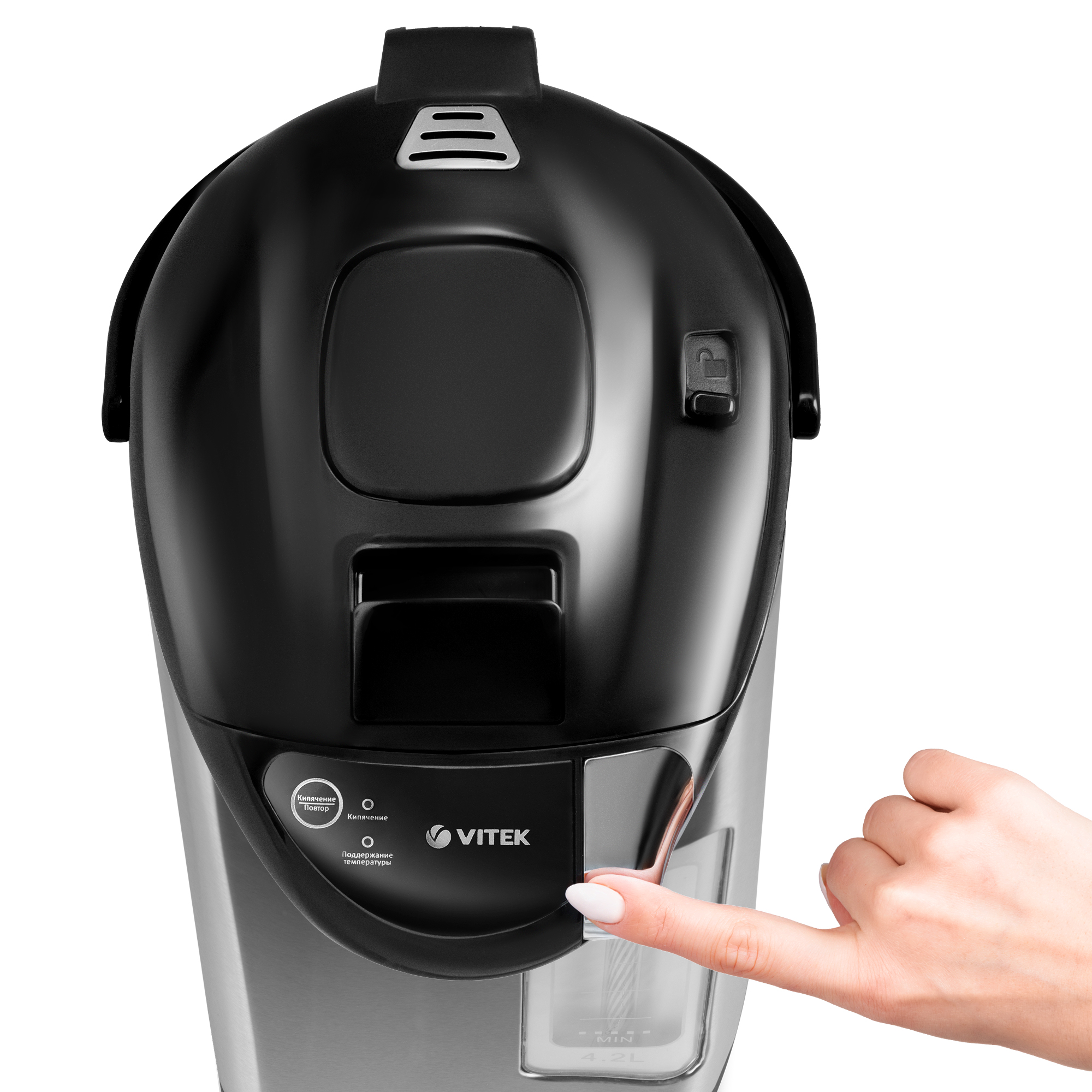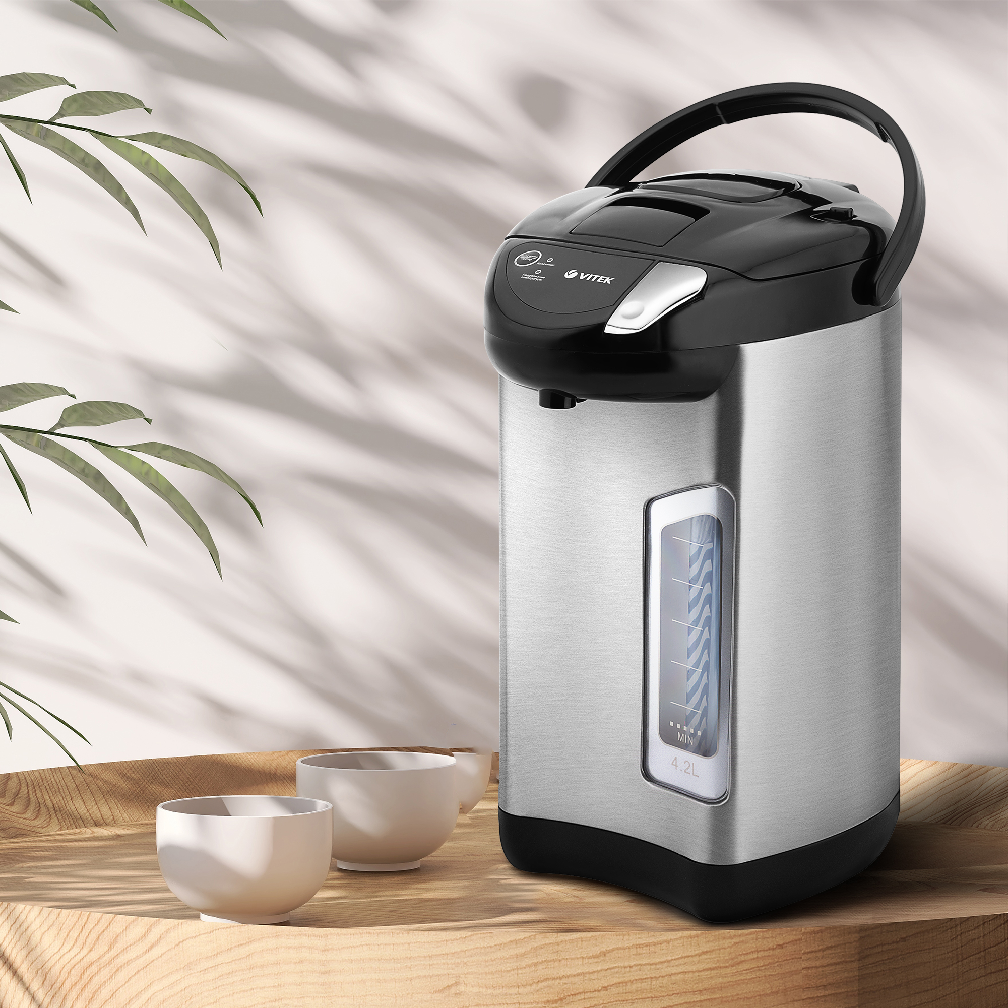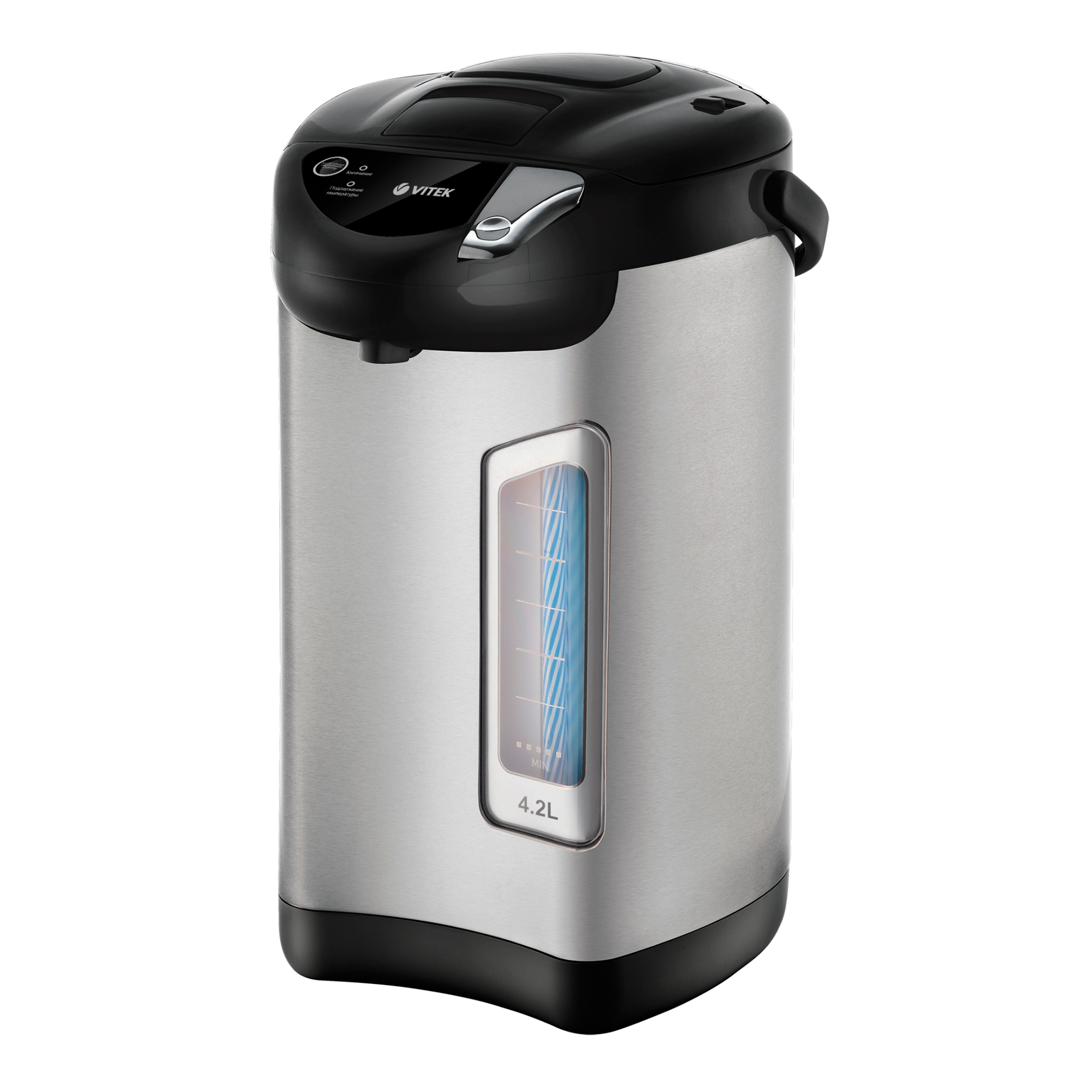 Термопот VITEK VT-1195 позволит не только вскипятить большой объем воды (до 4,2 л), но и сохранить ее в горячем виде в течение дня, благодаря функции поддержания температуры. Максимальная мощность устройства — 730 Вт. Следить за уровнем воды, на корпусе прибора, изготовленного из высококачественной нержавеющей стали, позволяет удобная широкая шкала. В термопоте предусмотрено три способа подачи воды: чтобы налить ее в емкость, можно воспользоваться специальным насосом (механической помпой), электрической помпой или просто нажать чашкой на клапан. Хотите еще раз нагреть воду? Нет ничего проще: в термопоте имеется функция повторного кипячения. Благодаря надежной системе защиты перегрев прибора исключен. Купите термопот VITEK VT-1195: сделайте свою жизнь максимально комфортной и приятной!