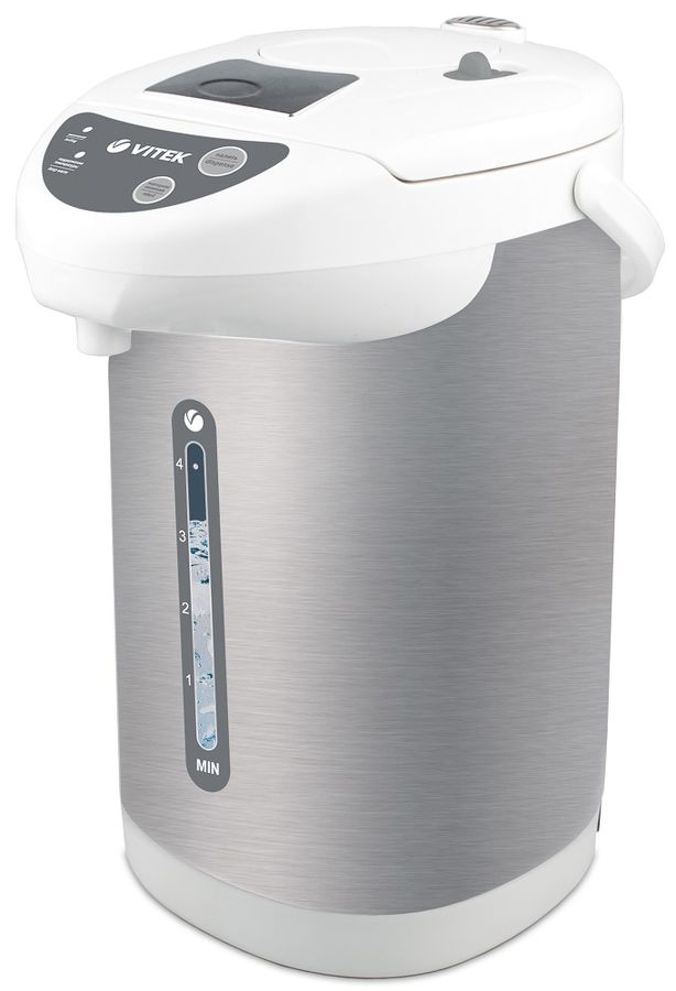 Термопот VITEK VT-1196 может вскипятить и сохранить горячей 4 л воды. Ее количество позволяет контролировать шкала, нанесенная на поверхность емкости. Налить нужное количество жидкости не представит сложности: достаточно нажать на кнопку подачи воды. Прибор нет необходимости поднимать или наклонять. Его конструкция такова, что жидкость подается в приготовленную емкость с помощью насоса, работающего в комбинированном формате. Устройство снабжено фильтром для очистки воды от накипи и различных примесей, имеет защиту от перегрева.