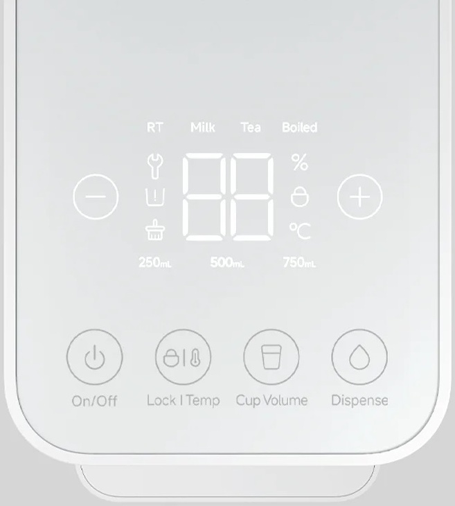 4 уровня температуры, 3 уровня выдачи воды (250 мл, 500 мл или 750 мл), блокировка от детей, светодиодный дисплей, нагрев от 45° до 95° с шагом в 1°, сенсорное управление, съемный резервуар для воды