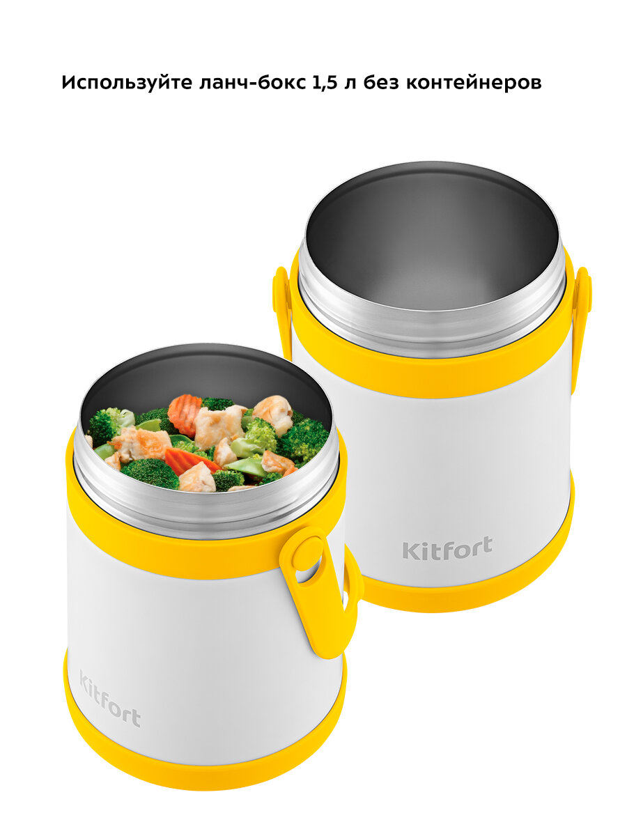 Вы можете использовать ланч-бокс без контейнеров. Благодаря колбе из нержавеющей стали ланч-бокс хорошо сохраняет температуру. Ёмкость КТ-1241 без контейнеров составляет 1,5 литра.