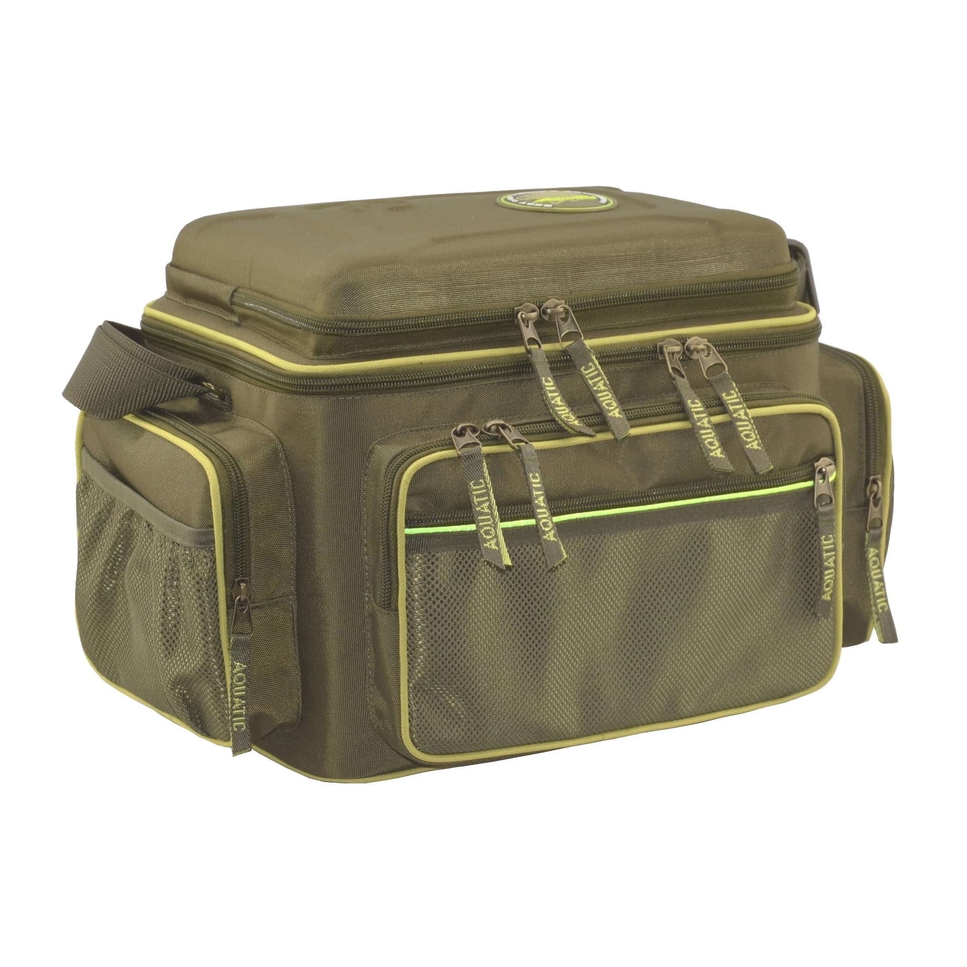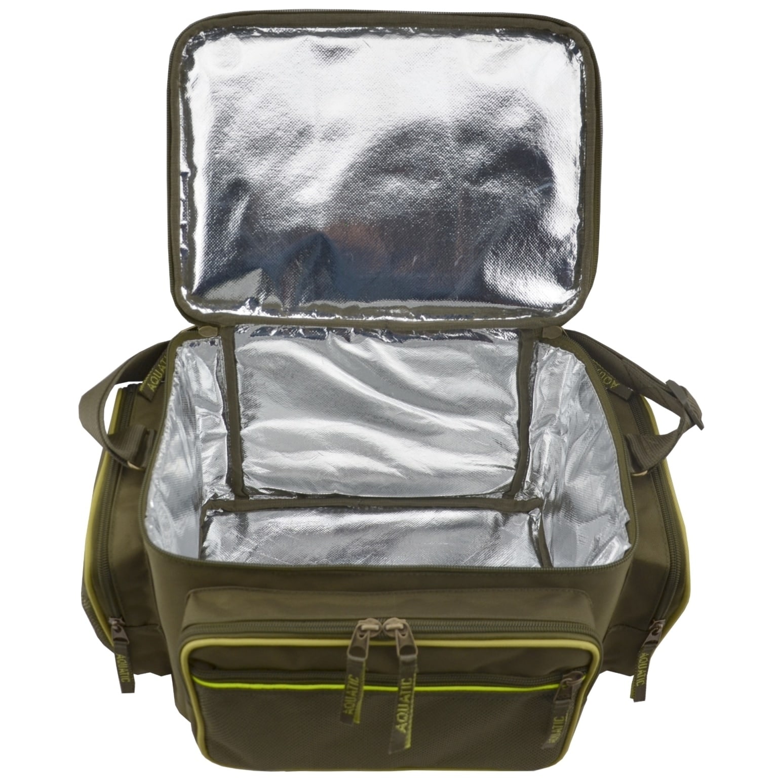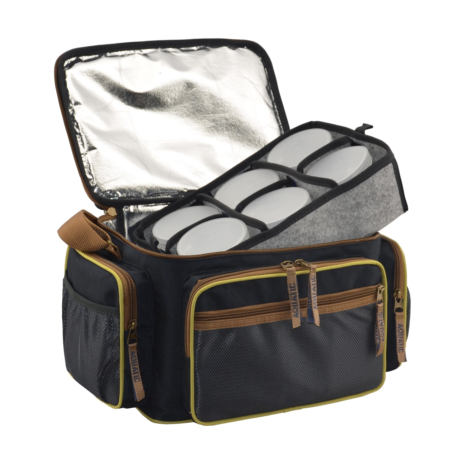 Термо-сумка Aquatic С-44 с банками для хранения дипов и насадок. Термо-сумка полностью выполнена из высококачественного износостойкого нейлона и имеет прорезиненное дно, благодаря чему практически не промокает и легко отмывается от загрязнений. Для максимально длительного хранения ваших дипов и насадок весь внутренний объем термо-сумки покрыт технологичным термоизоляционным материалом. Термо-сумка укомплектована 6-ю банками диаметром 89 мм и высотой 80 мм и 12-ю банками диаметром 58 мм и высотой 100 мм, размещенными в двух специальных съемных отделениях с мягкими перегородками на липучках, которые позволяют подгонять размеры ячеек для банок другого объема. Верхняя крышка на молнии имеет вместительный формованный карман, в котором можно хранить рыболовную коробку, или другие полезные аксессуары. Спереди и по бокам расположены три объемных кармана на молнии с накладными карманами из сетки для различных рыболовных принадлежностей. Для удобства транспортировки термо-сумка имеет регулируемый по высоте плечевой ремень из прочной стропы.