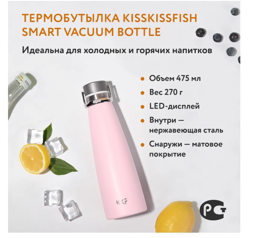 Приятное на ощупь матовое покрытие и сочный яркий цвет термобутылки будут каждый день поднимать настроение ее владельцу. KissKissFish SMART VACUUM BOTTLE станет прекрасным подарком для всех, кто любит брать любимые напитки с собой.