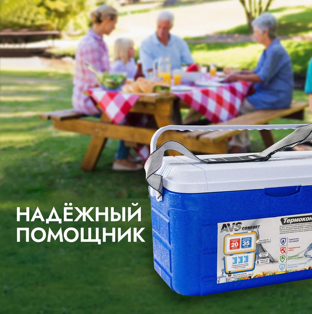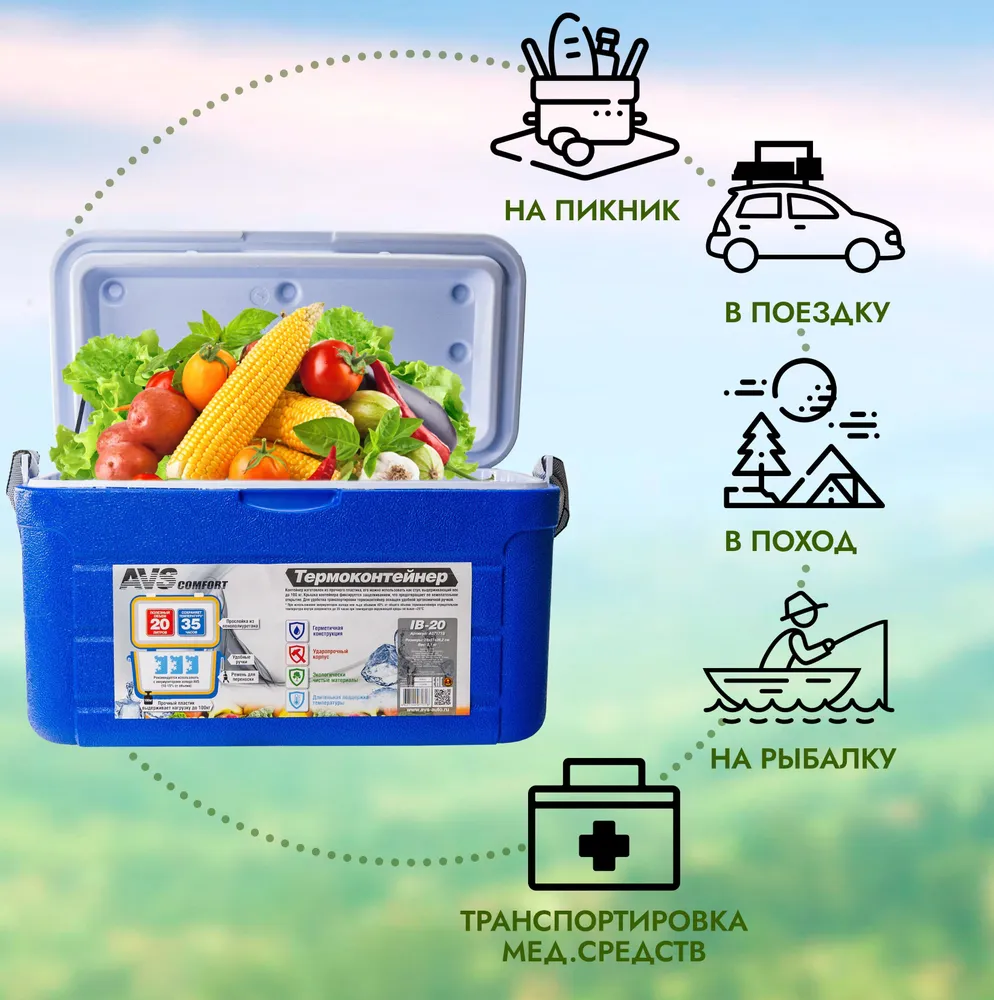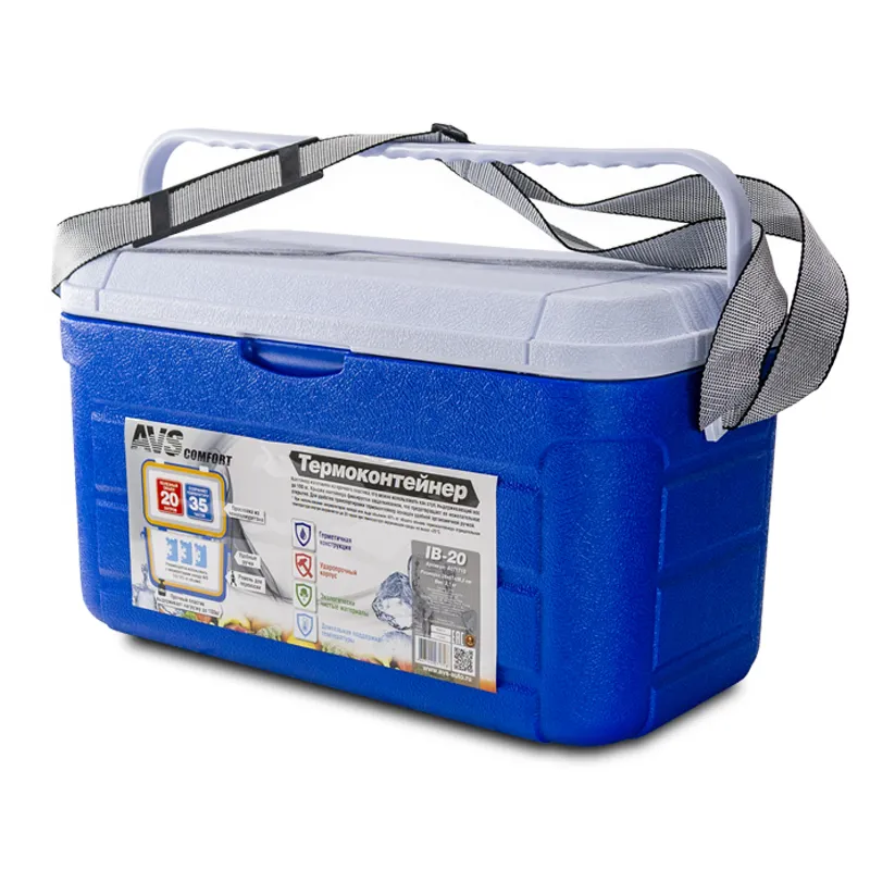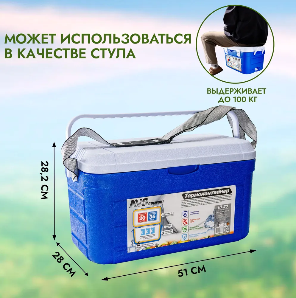 Контейнер AVS IB-20 изготовлен из прочного пластика, его можно использовать как стул, выдерживающий вес до 100 кг. Для удобства транспортировки помимо ручки присутствует ремень. При использовании аккумуляторов холода или льда объемом 40% от общего объема термоконтейнера отрицательная температура внутри сохраняется до 35 часов при температуре окружающей среды не выше +25°С.