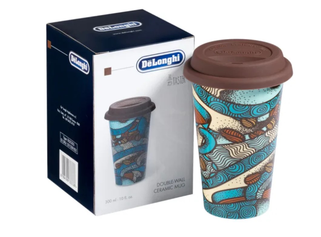 Кружка De'Longhi "The Taster" отлично подойдет для любителей необычного дизайна. Кружка выполнена из керамики, имеет двойные стенки и двойное дно, поэтому любимый напиток будет долго оставаться горячим. Материал крышки - безопасный силикон. Благодаря объему в 300мл Вы сможете взять с собой любой напиток. Также кружку можно мыть в посудомоечной машине