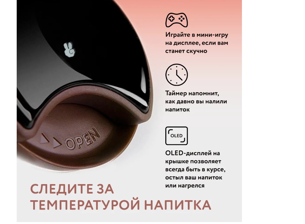 Объем термокружки составляет 430 мл. На крышке имеется сенсорный OLED-экран, на котором выводится информация о температуре и объеме налитой внутрь жидкости. Он работает от батарейки CR2032, срок службы которой — до 12 месяцев в режиме ожидания. Также имеется функция таймера.
