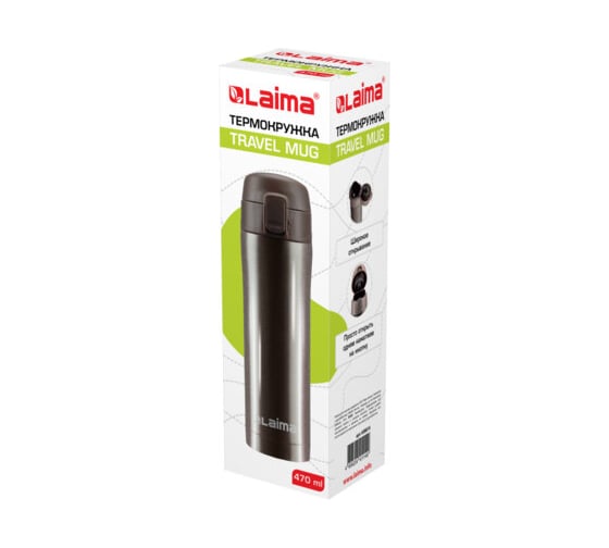 Термокружка LAIMA с двойной стальной стенкой изготовлена из нержавеющей стали марки 304 медицинского уровня. Сконструирована по вакуумной технологии.
