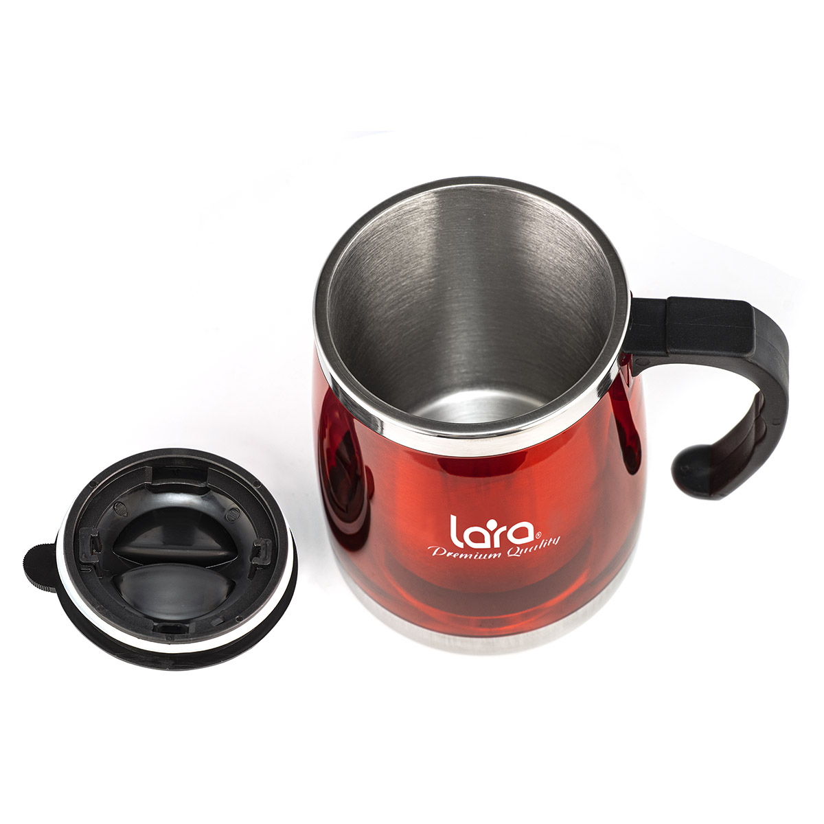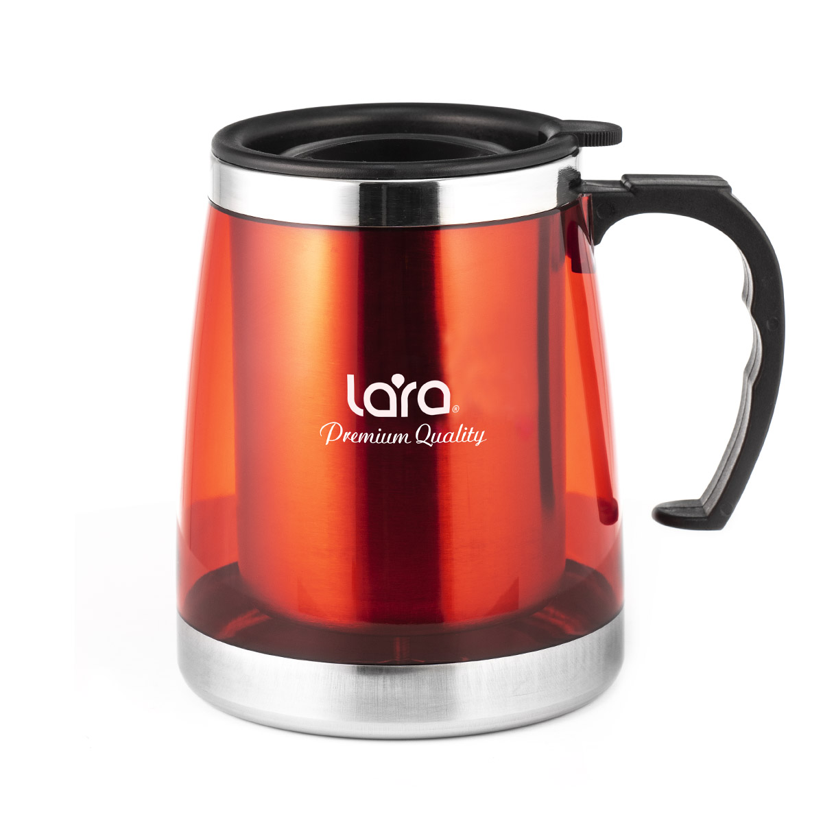 Удобная и яркая термокружка LARA LR04-39 с ручкой подходит для горячих и холодных напитков. Благодаря двойным стенкам напиток дольше сохраняет температуру. Конструкция крышки позволяет без труда снять ее с кружки. Благодаря мягкому покрытию донышка кружка устойчиво стоит на столе и не царапает его поверхность. Ручка имеет анатомическую форму, повторяющую контур пальцев. Колба изготовлена из нержавеющей стали.