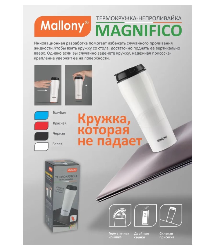 Термокружка сохраняет необходимую температуру напитков длительное время. Инновационная разработка помогает избежать случайного проливания жидкости. Чтобы взять кружку со стола, достаточно поднять ее вертикально вверх. Однако если вы случайно заденете кружку, надежная присоска-крепление удержит ее на поверхности, не дав «смахнуть» на пол.