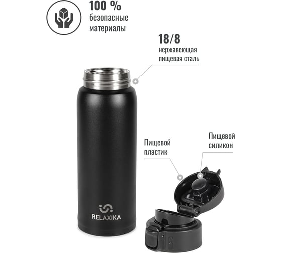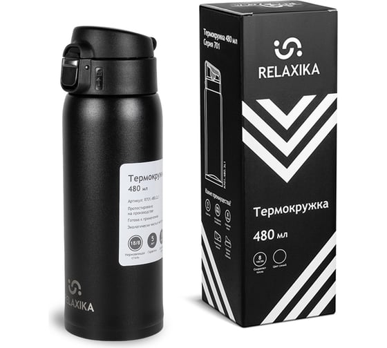 Термокружка Relaxika 701 0.48 л, черная R701.480.2L1 подходит для ежедневного использования дома, на кухне, на даче, на работе. А также во время занятий спортом. Благодаря вакуумной изоляции сохранит ваши напитки горячими или холодными в течение нескольких часов.