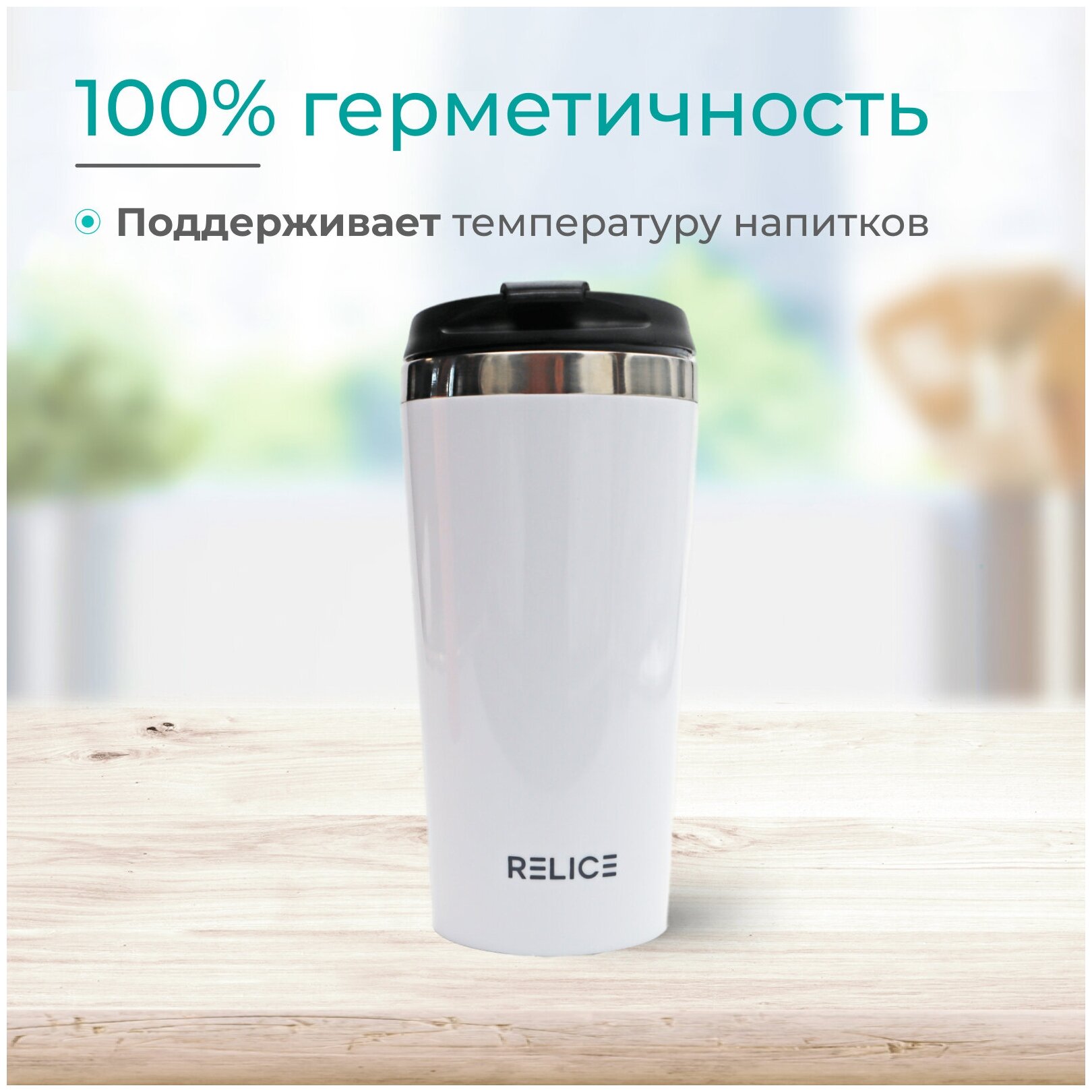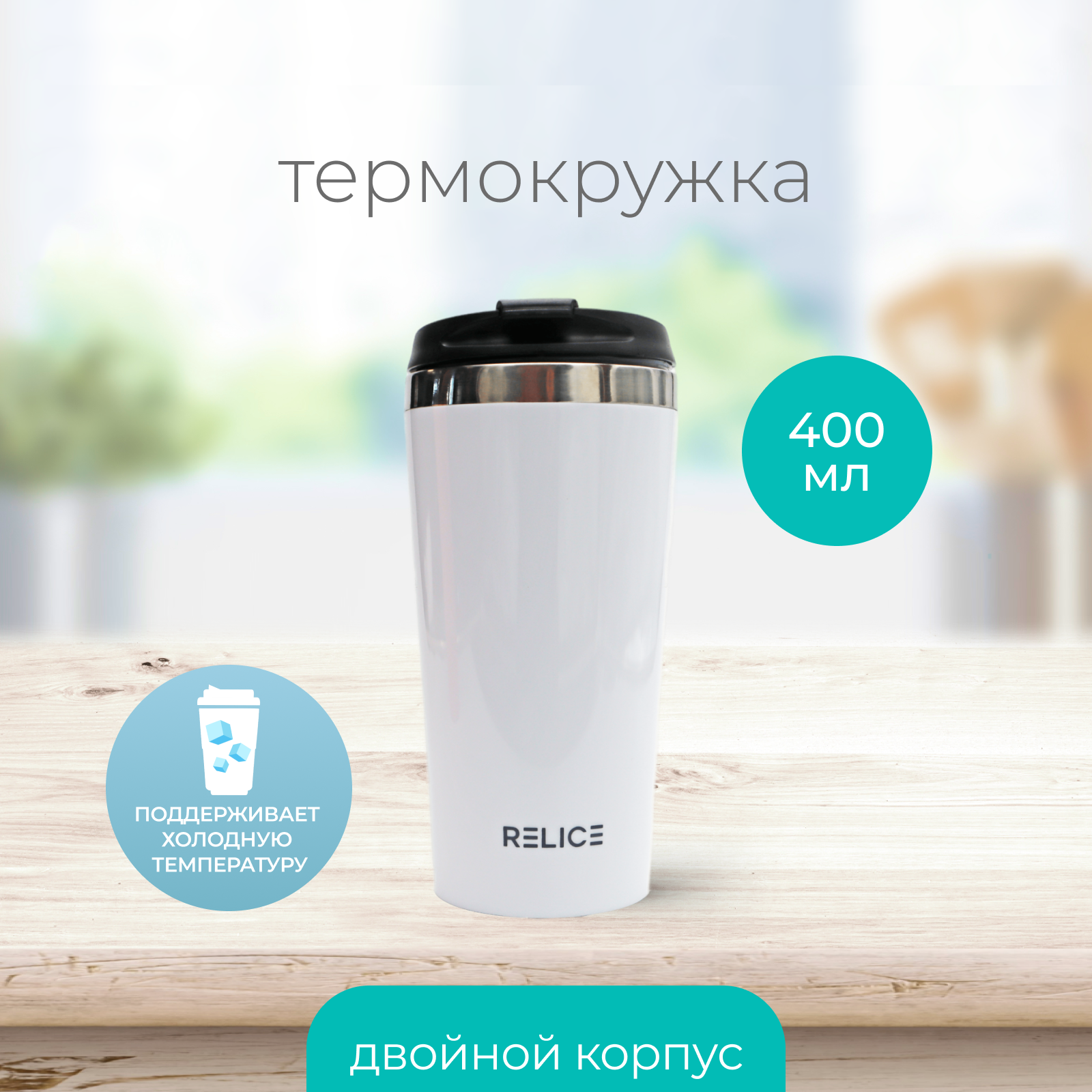 Термокружка белого цвета отличается высокопрочным корпусом с двойными стенками. Внешняя часть выполнена из пластика, внутренняя — из нержавеющей стали. Тепло и холод сохраняются на протяжении 1 часа. Колба не изменяет вкус и аромат напитков, не впитывает запахи и пигменты, что обеспечивает безопасность и удобство эксплуатации.
