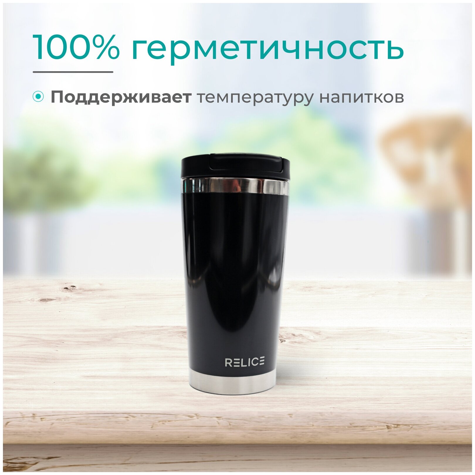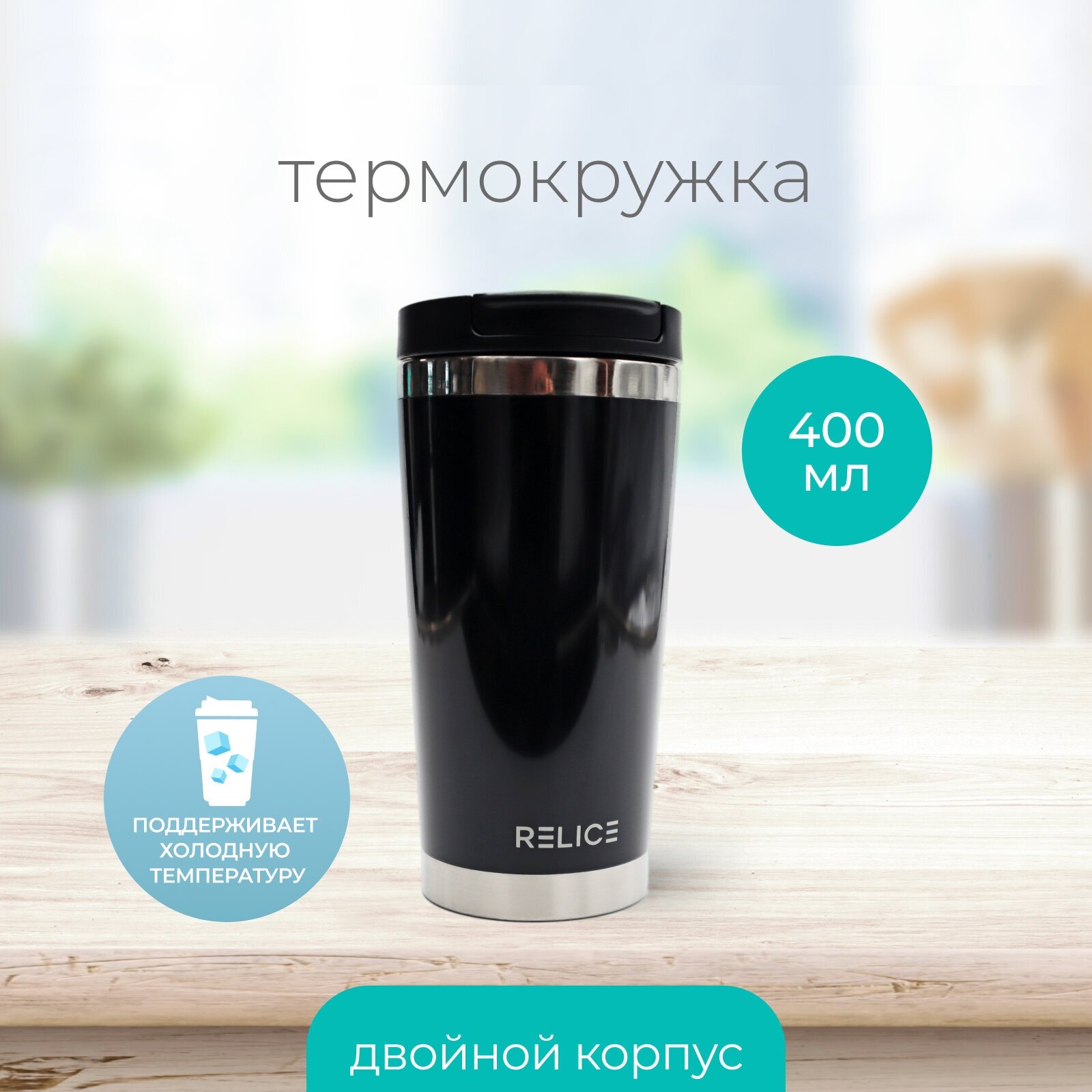Термокружка черного цвета с горлышком диаметром 8 см отличается вместимостью 400 мл. Крышка с резьбовым креплением плотно фиксируется на основании, чем достигается герметичность. Наличие клапана обеспечивает удобство питья и предотвращает случайное протекание жидкости.