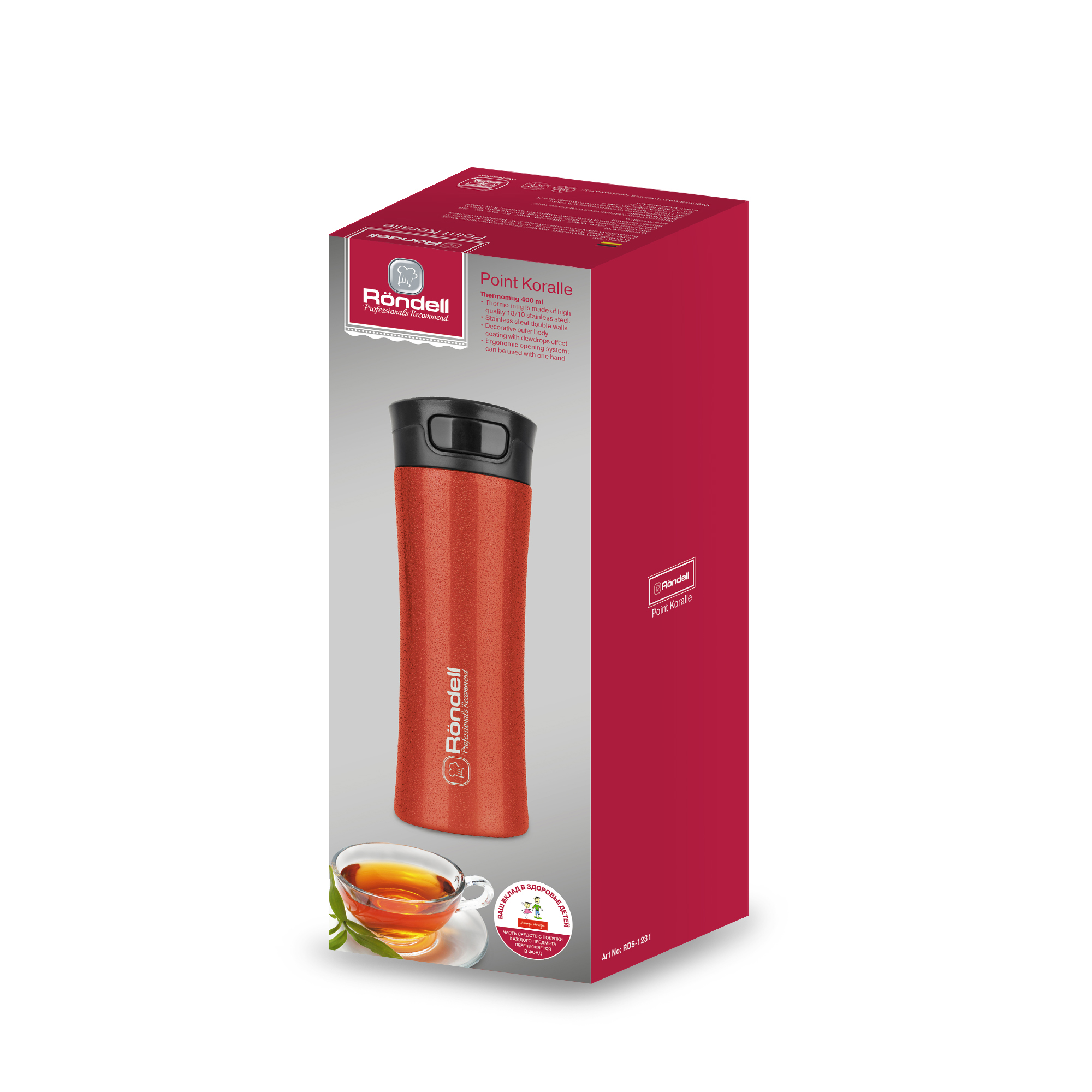 Если вы наполняете свою жизнь красивыми вещами, то непременно делаете ее лучше. Поэтому внешний вид даже самых обычных, повседневных вещей имеет значение! Убедительным примером тому способна стать термокружка Point Koralle от Röndell, идеально подходящая как для горячих, так и для холодных напитков. Она сразу привлекает внимание своим ярким кораллово-лососевым цветом, одним из самых актуальных в сезоне. А специальное внешнее покрытие с эффектом капель росы на поверхности превращает термокружку в настоящее произведение дизайнерского искусства. Ее потребительские свойства также на высоте. Благодаря двойным стенкам из нержавеющей стали термокружка довольно долго сохраняет температуру напитков, содержащихся внутри, в неизменном виде. Пользоваться этим устройством очень удобно: открывать и закрывать его можно простым нажатием одной кнопки.