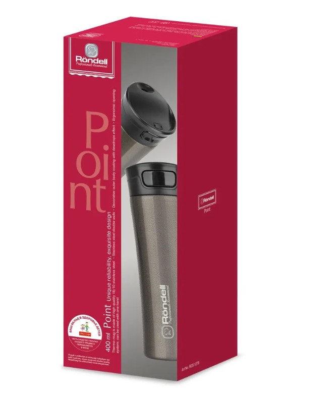 Термокружка 0,4 л Point Rondell RDS-1276Термокружка изготовлена из высококачественной нержавеющей стали 18/10. Двойные стенки из нержавеющей стали для лучшего сохранения температуры напитка. Внешнее декоративное покрытие с эффектном капель. Эргономичная система открывания: возможность использования одной рукой. Подходит для горячих и холодных напитков( кроме газированных ) Наполненное изделие храните в вертикальном положении. Не переворачивать! Не подходит для ПММ.